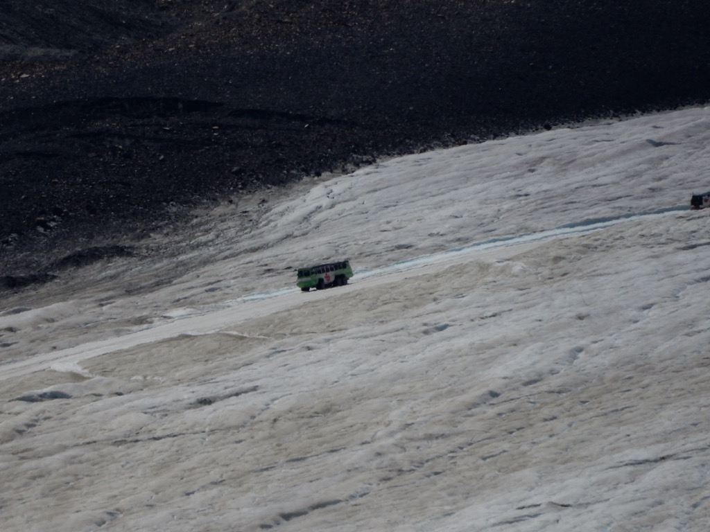 A snow bus crosses the Athabasca Glacier in Jasper Park.