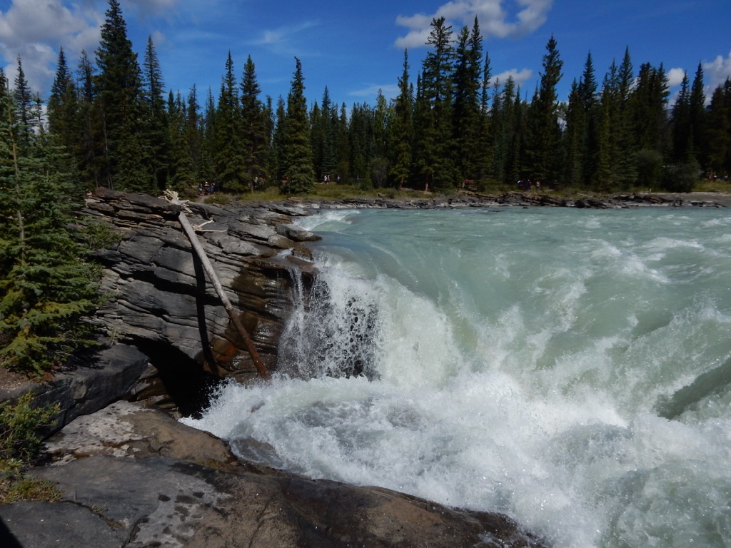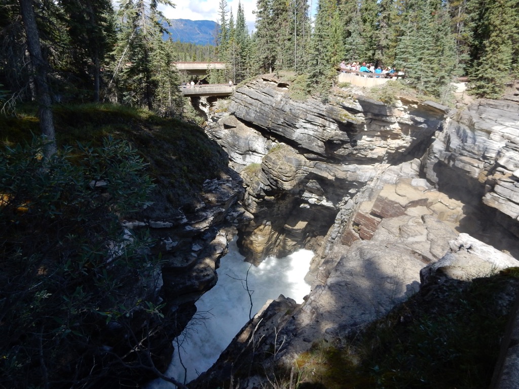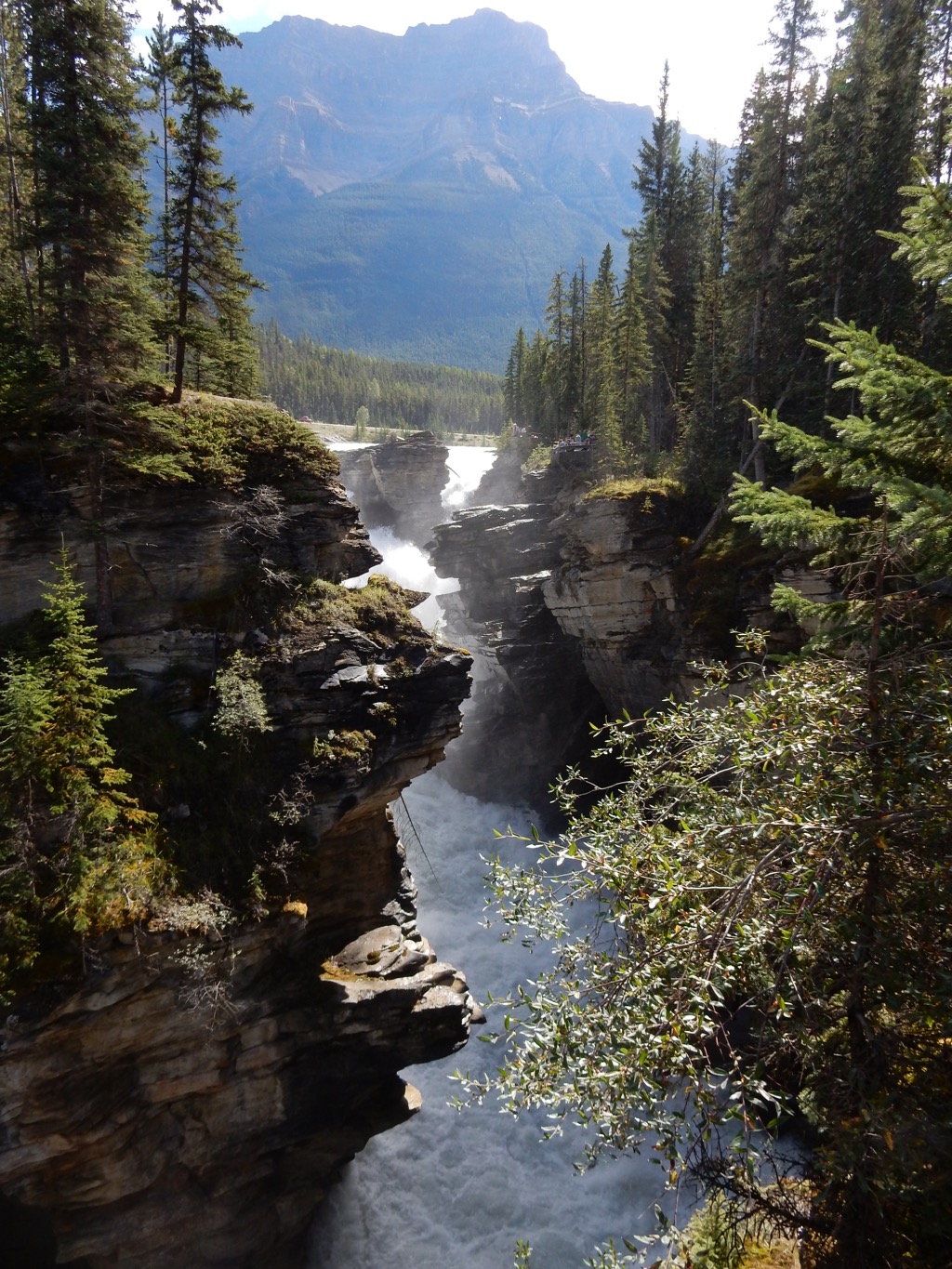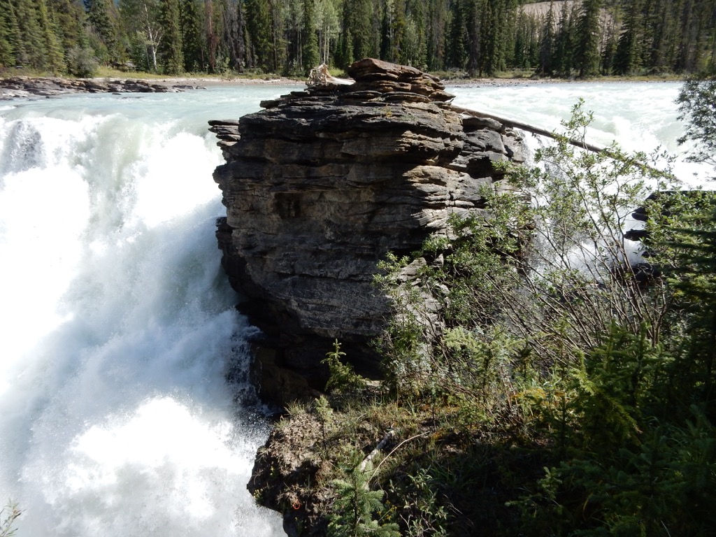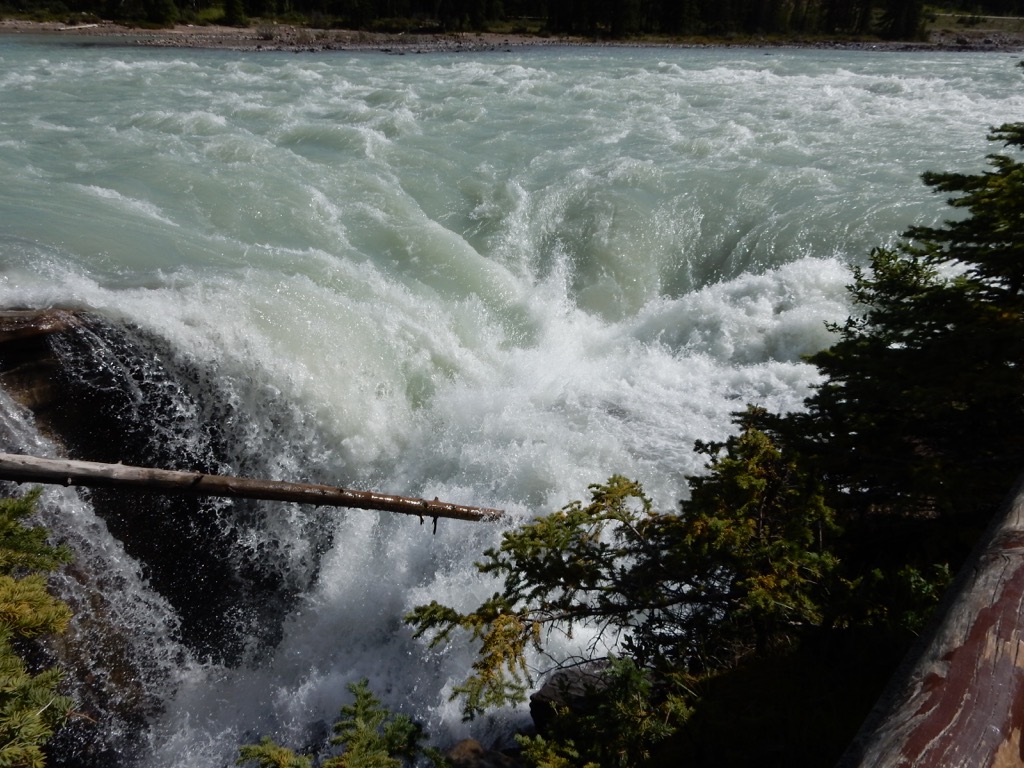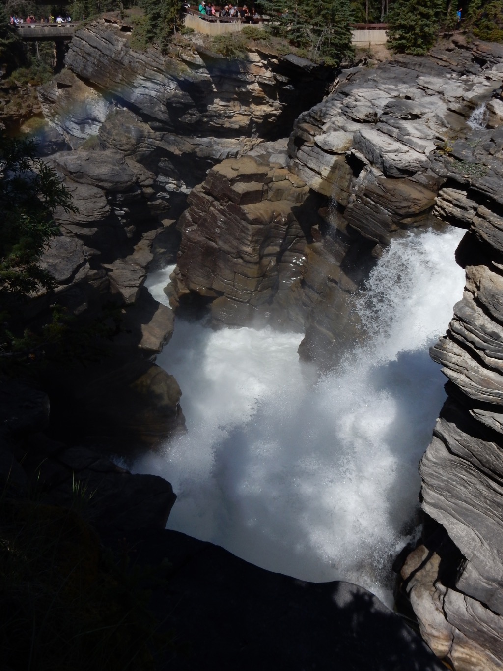Karen instinctively finds the most height-improving vantage point at the Athabasca Falls in Jasper Park.
