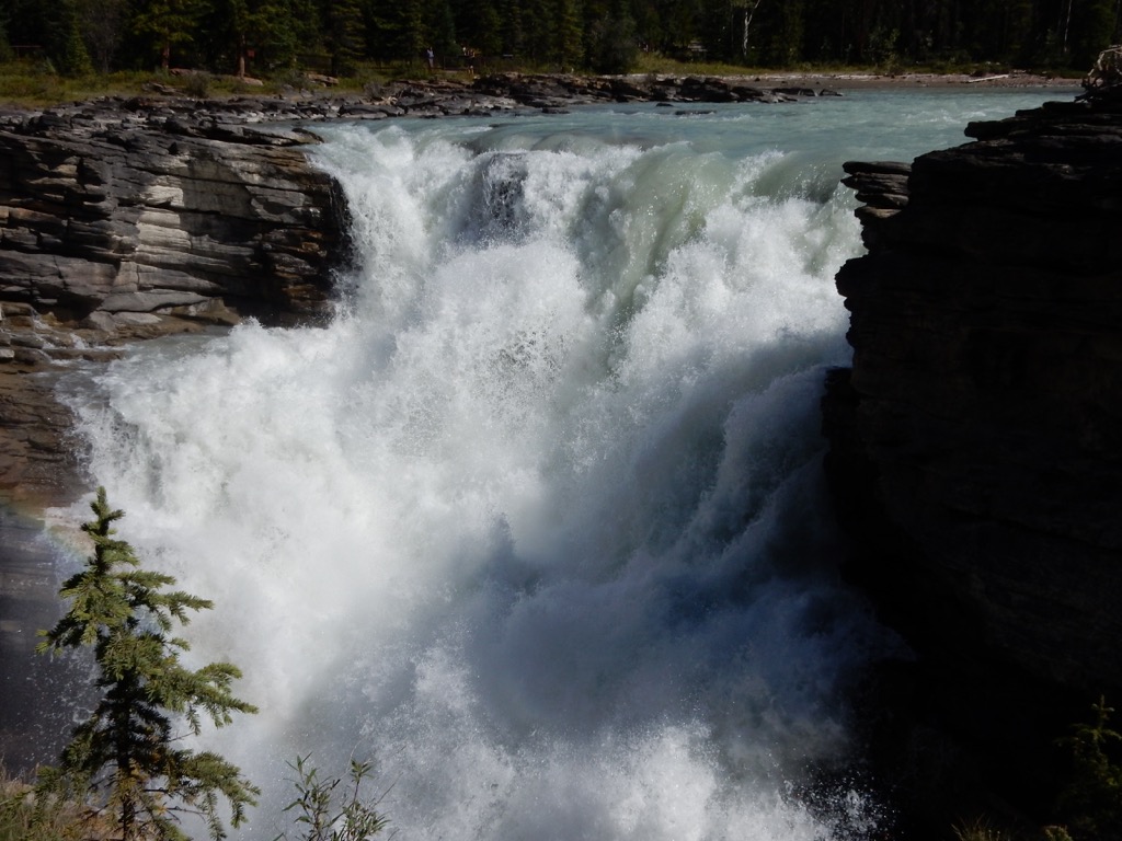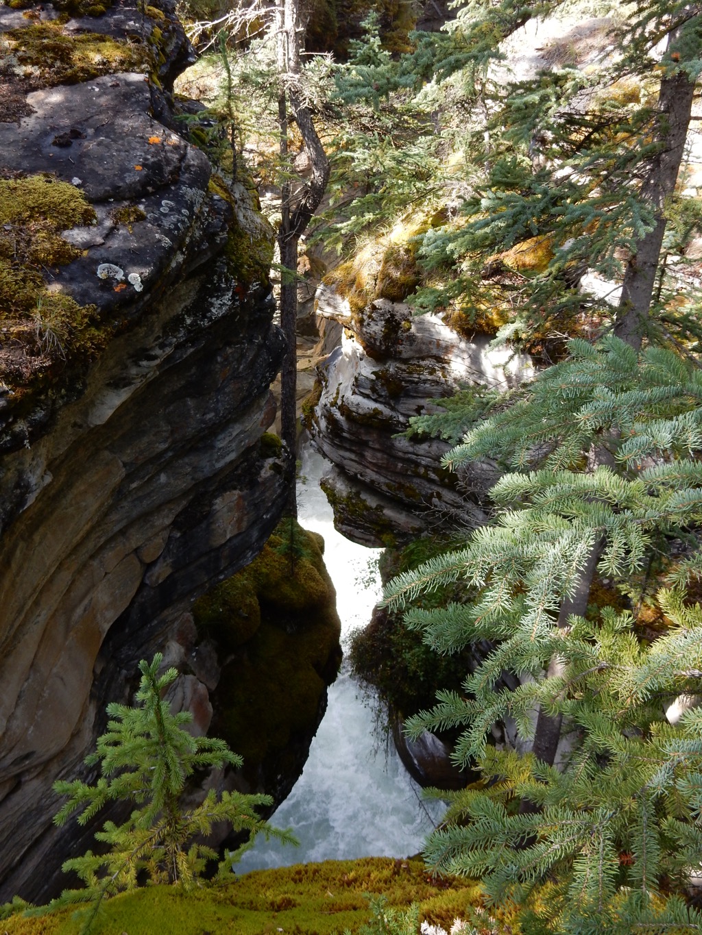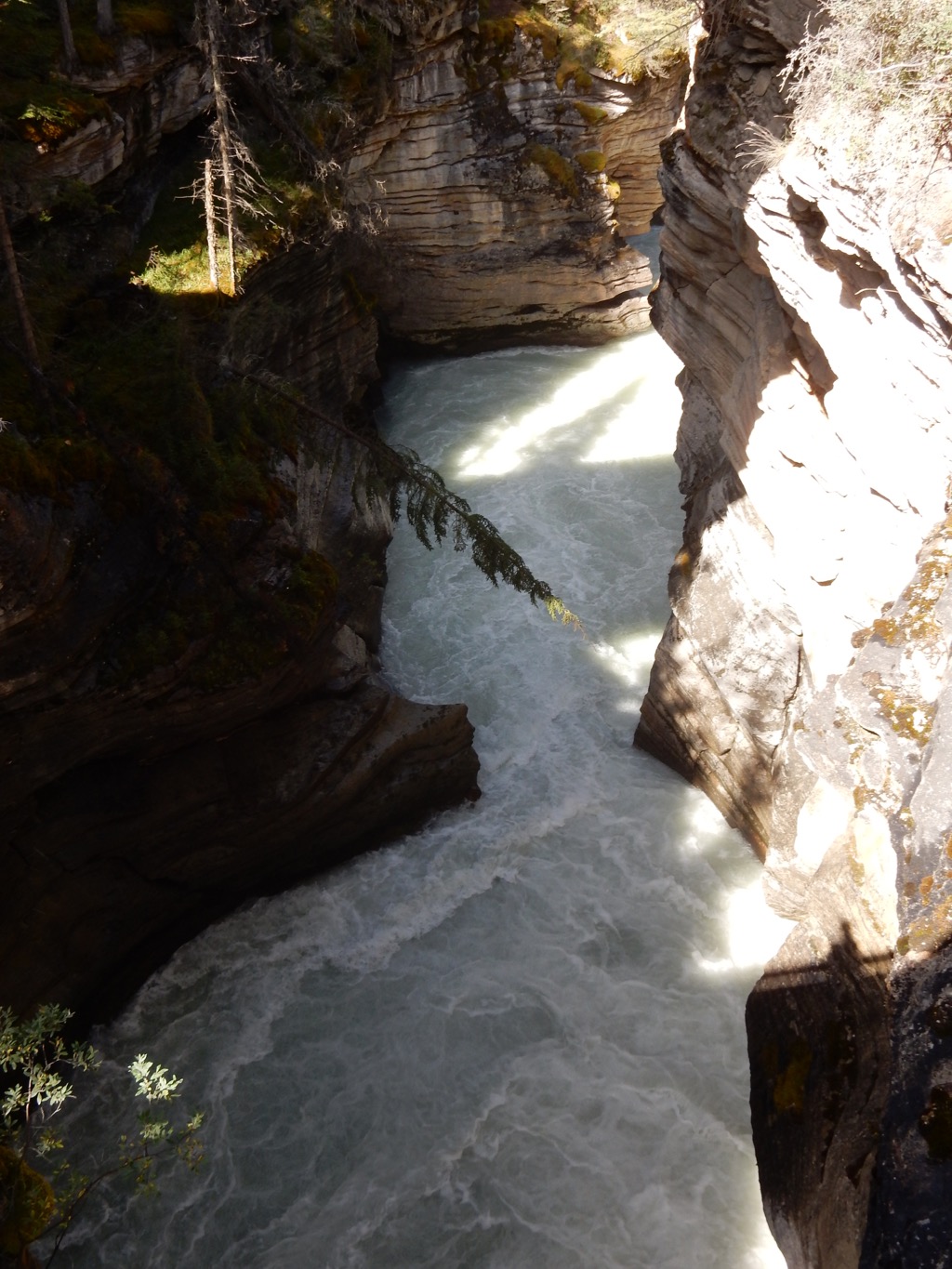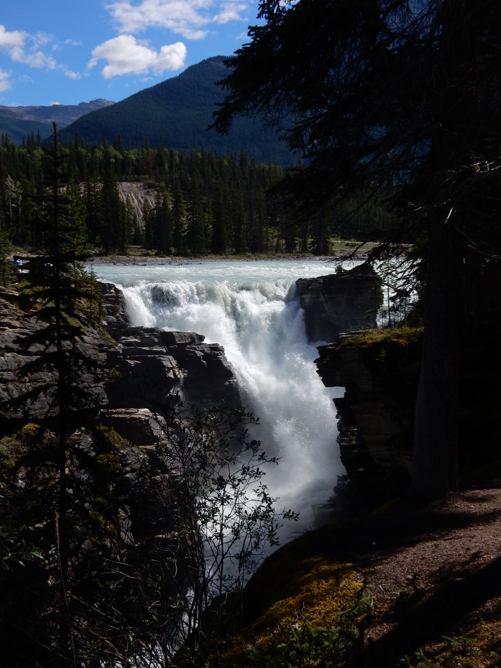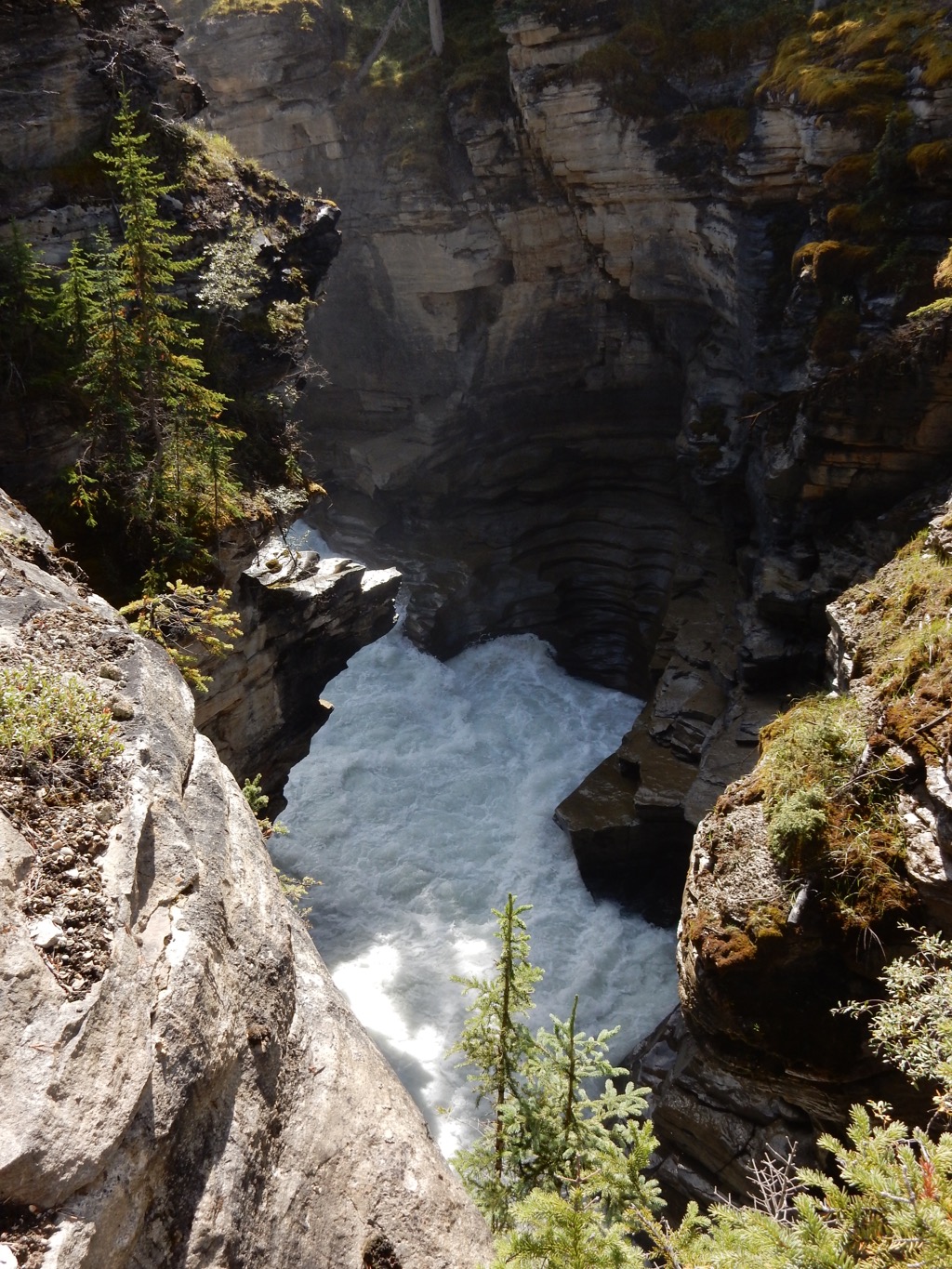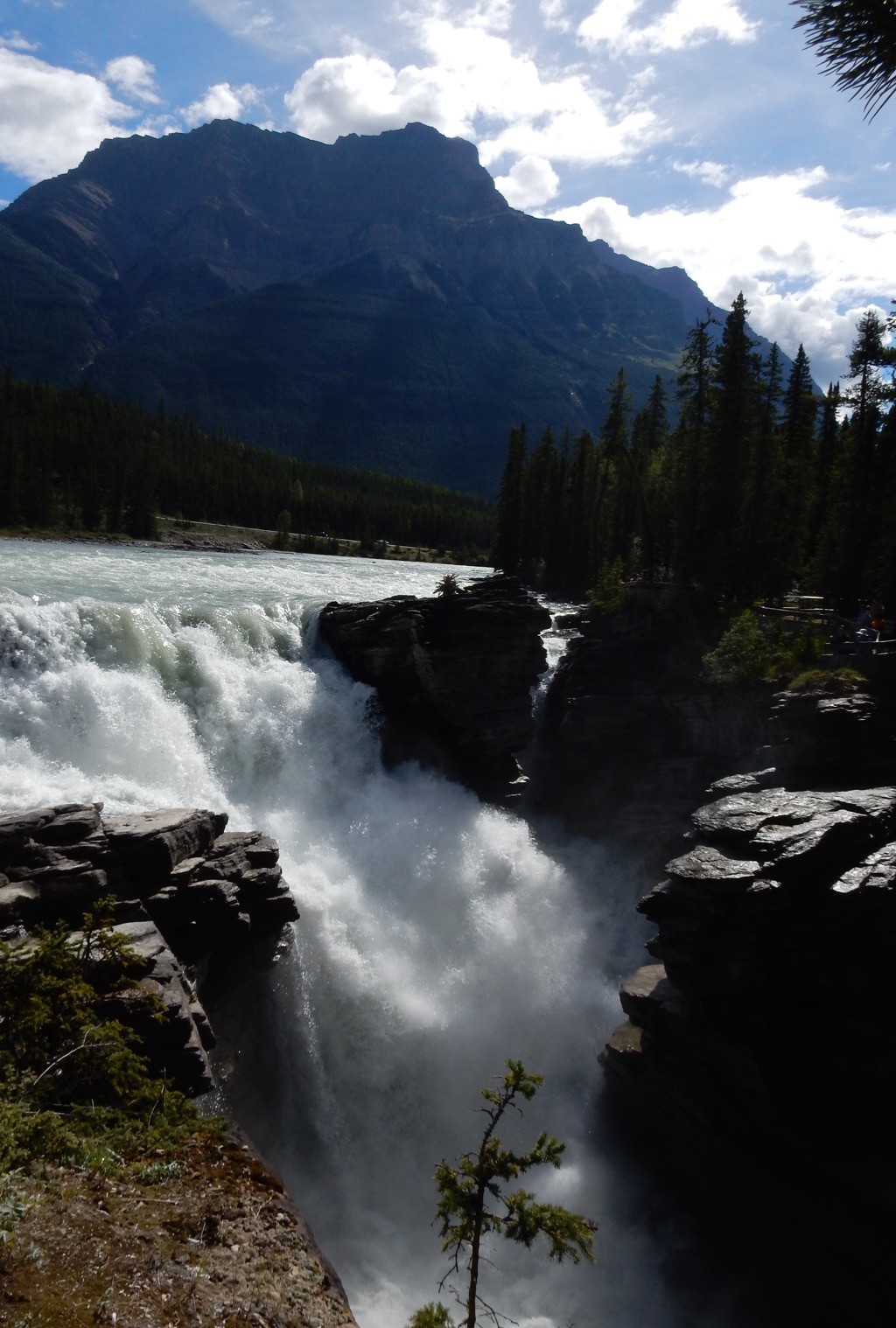 Karen instinctively finds the most height-improving vantage point at the Athabasca Falls in Jasper Park.