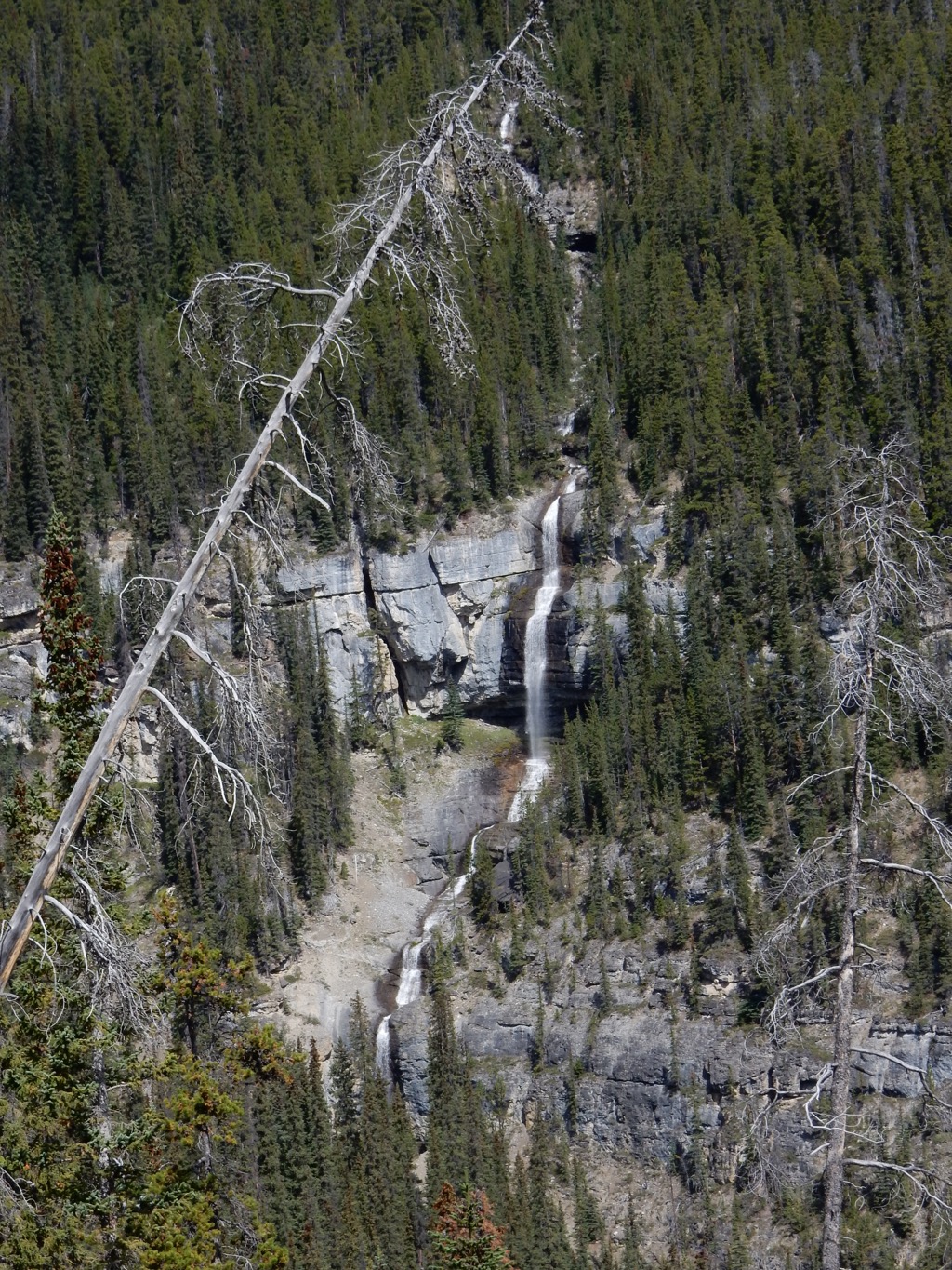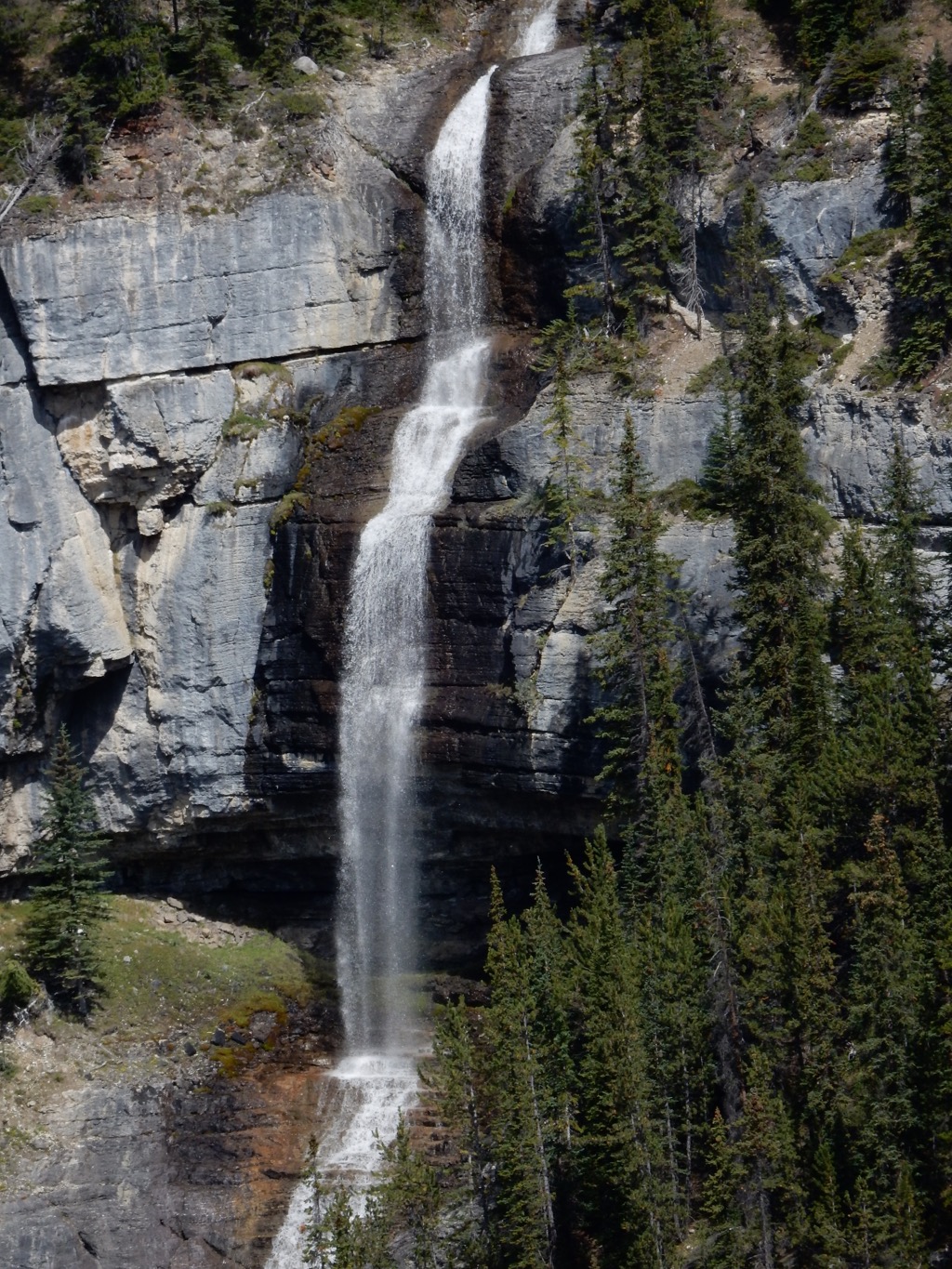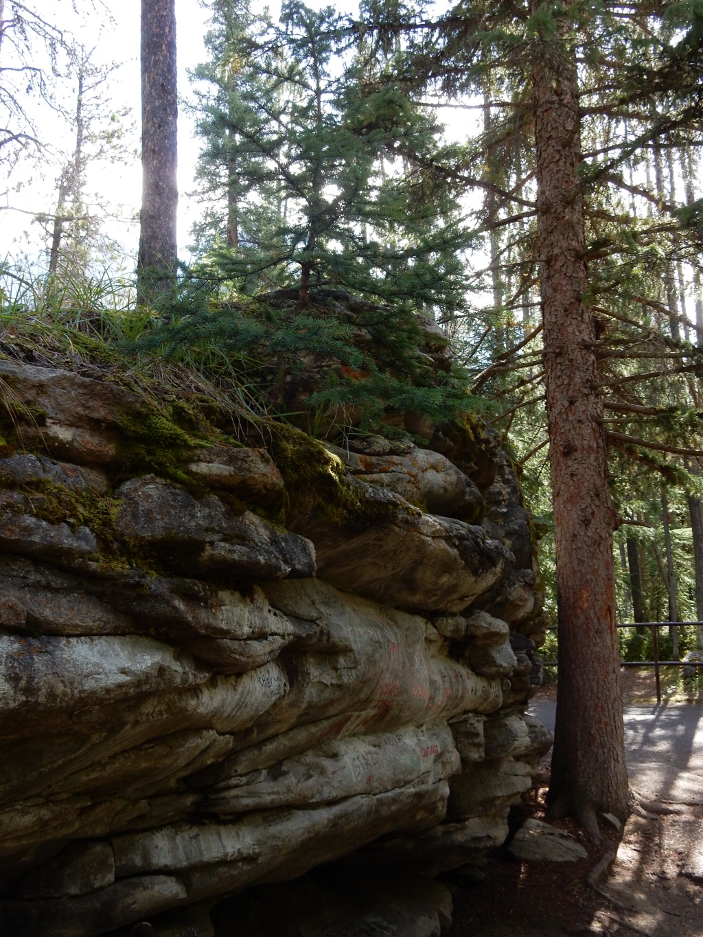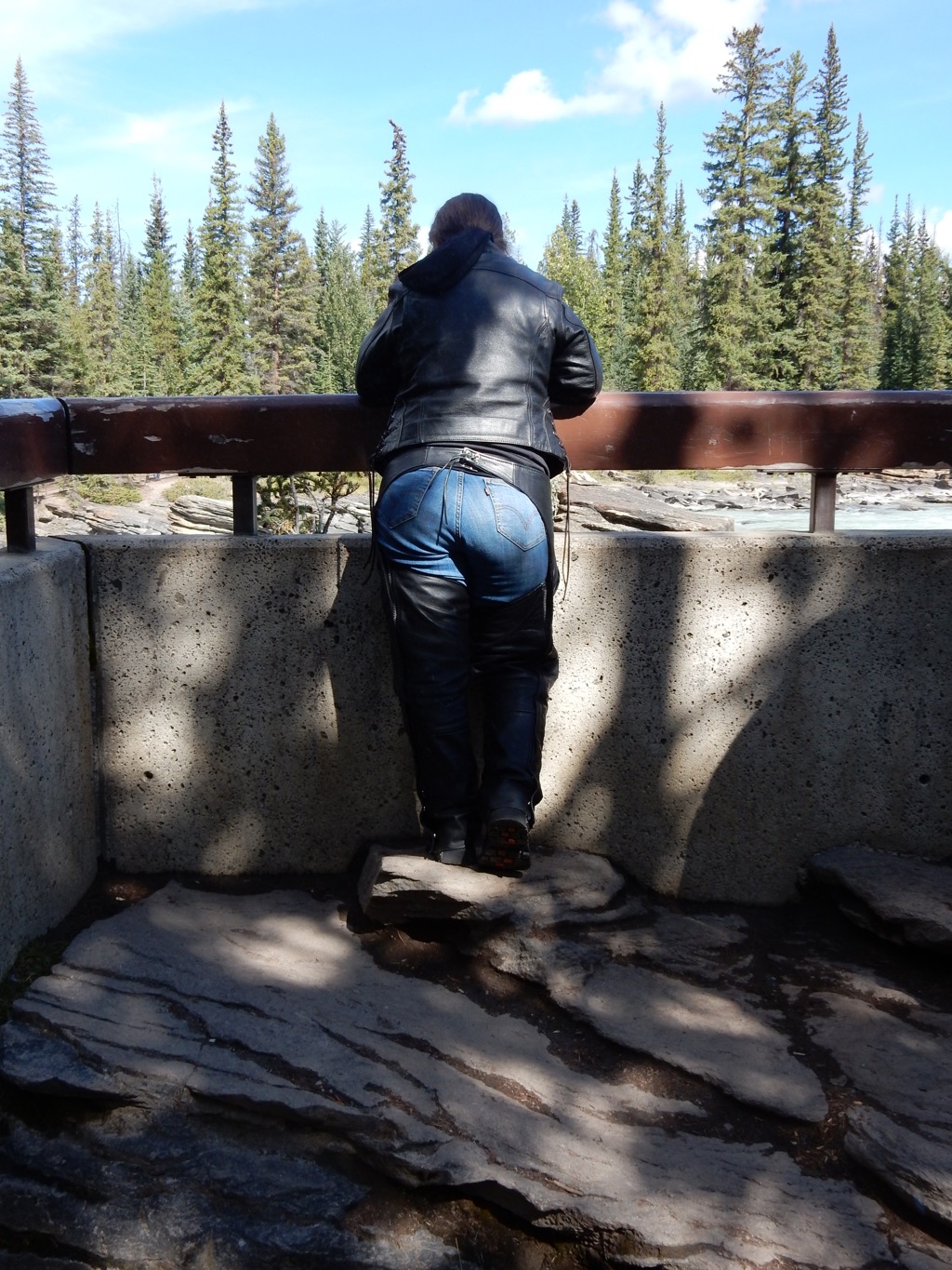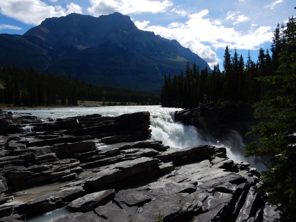 Karen instinctively finds the most height-improving vantage point at the Athabasca Falls in Jasper Park.