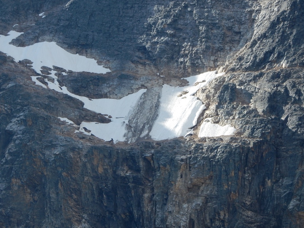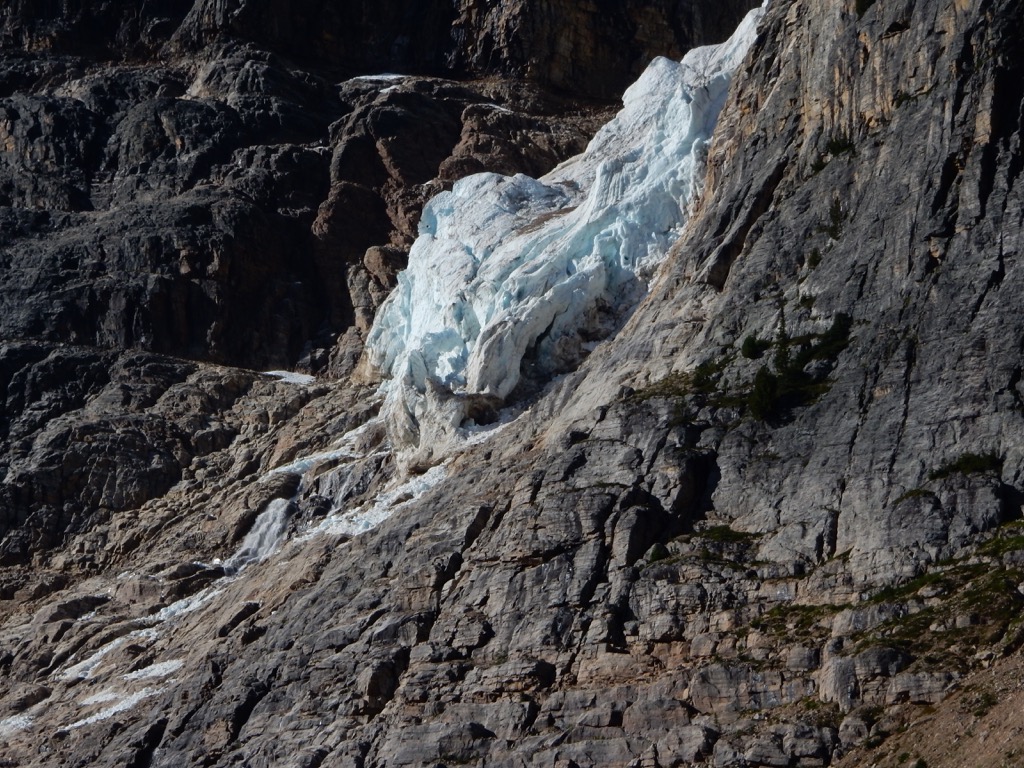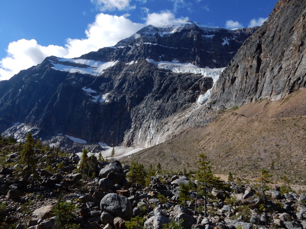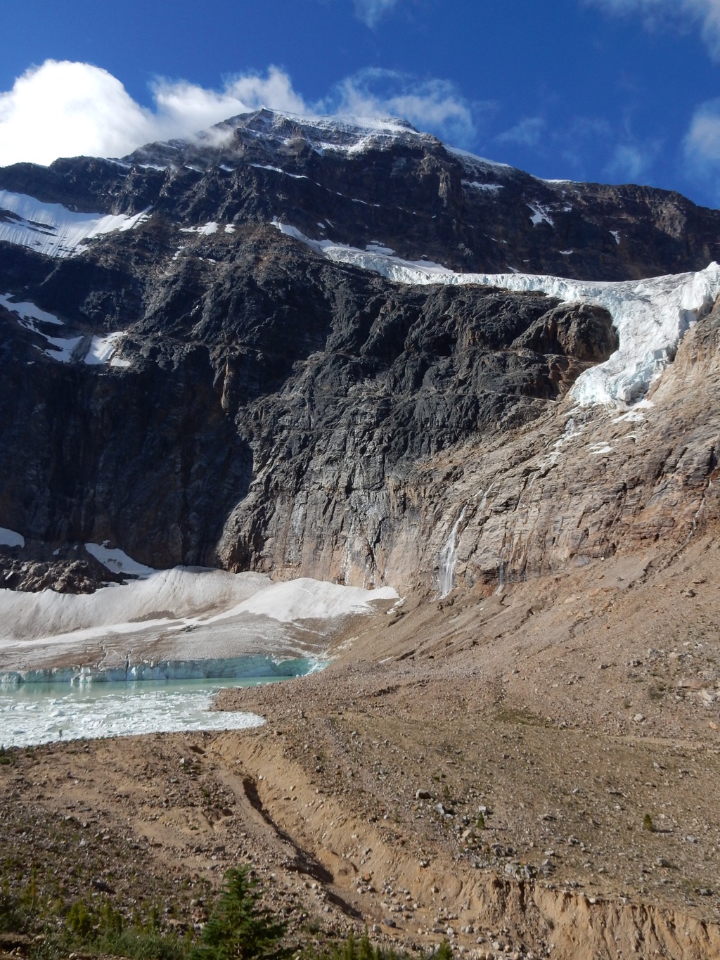You can trace the path of a recent rockslide on the face of Mt Edith Cavell in Jasper Park.