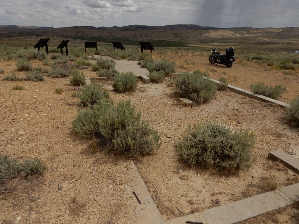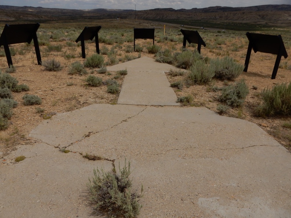 An old airmail service route arrow just off I80. This wide view shows the arrow, the beacon tower foundation, and the foundation for the support house that powered the beacon. In the background are placards that describe the site.