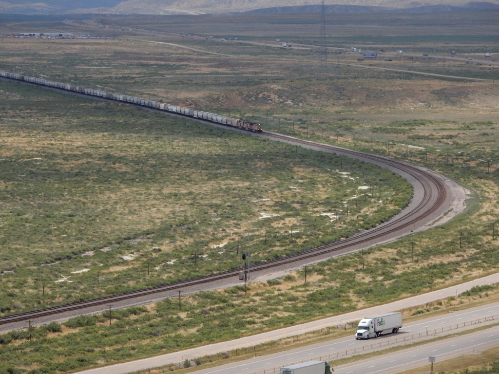 A closeup of an Union Pacific train heading east with a long line of covered hoppers, taken from an old airmail arrow just off I80.