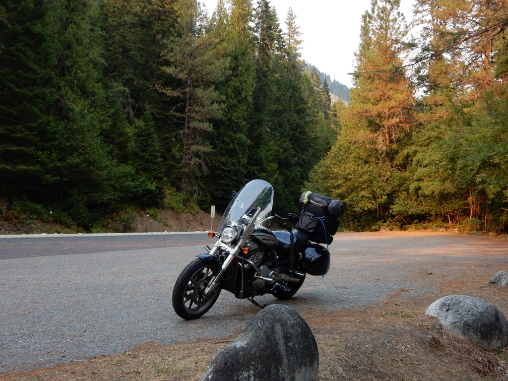 The Vector waits to continue west down the Clearwater River valley down the mountain from Lolo Pass in Idaho. The setting sun illuminates the trees in the background.