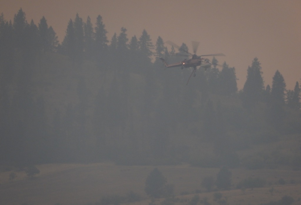 A Skycrane Helitanker helps fight the wildfire just west of Kamiah, ID. The pilot would draw water from the Clearwater River and drop it on the fire.