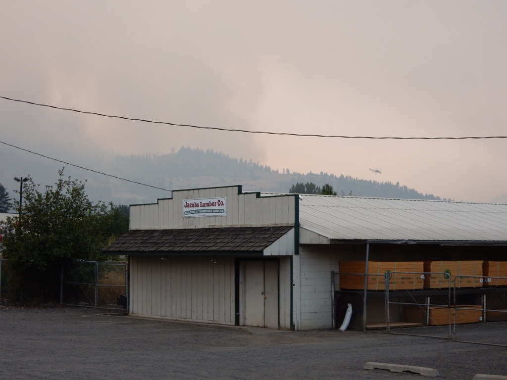 A view of a mountain wildfire from downtown Kamiah, ID. A Skycrane Helitanker is heading down the the Clearwater River for more water to drop on the blaze.