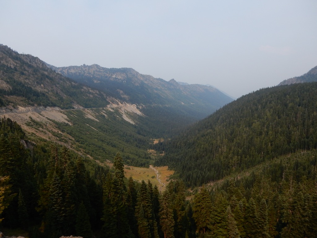 Looking northeast back down the valley I’d just ridden up, just east of Mt. Ranier. Smoke from wildfires is making the view a bit hazy.