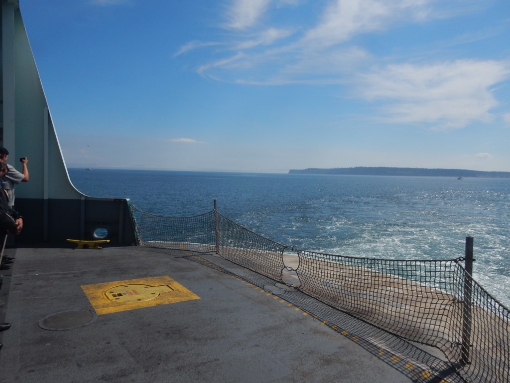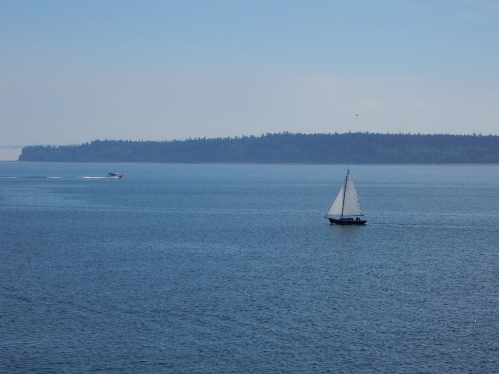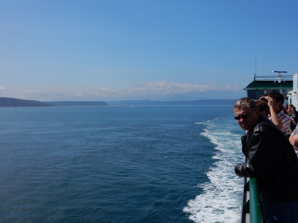 A view southwest during our ferry crossing from Port Townsend, WA to Whidbey Island. The Olympic Mountains are just visible in the distance.