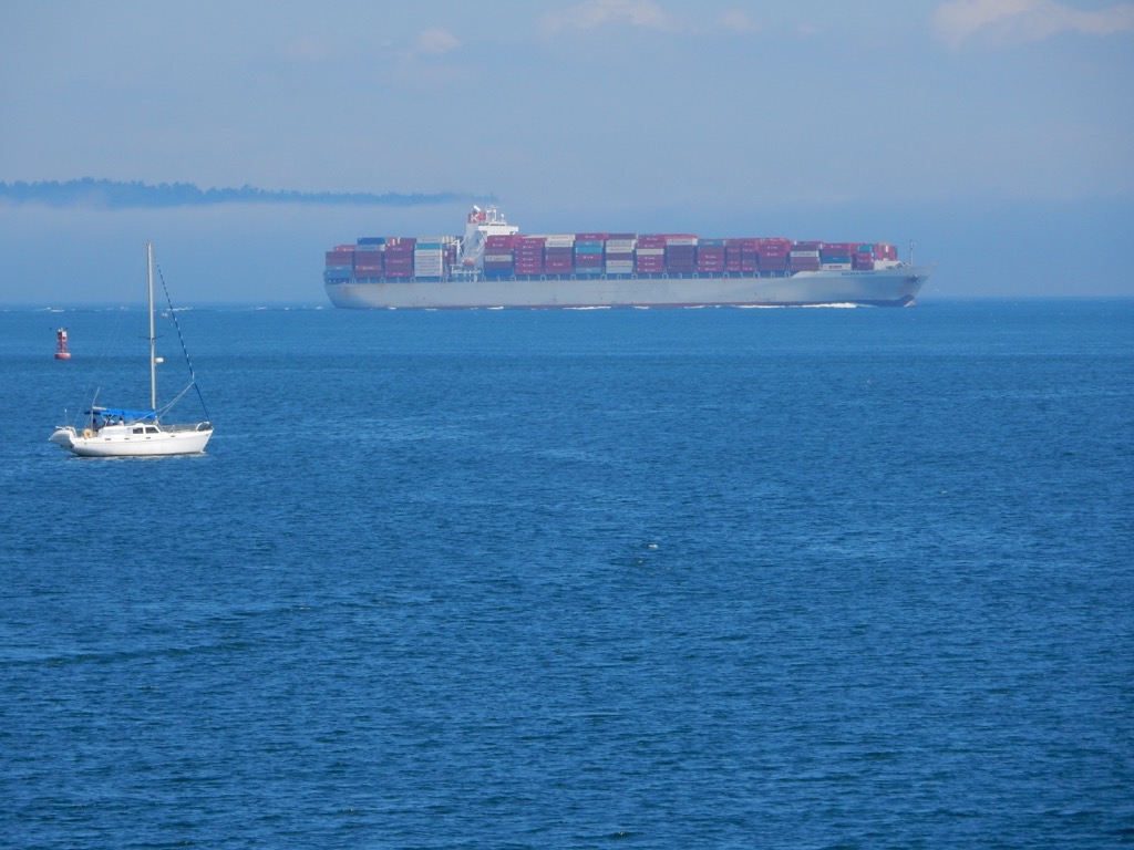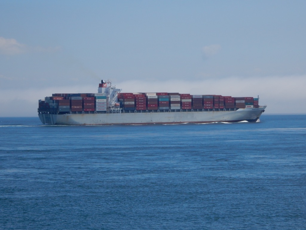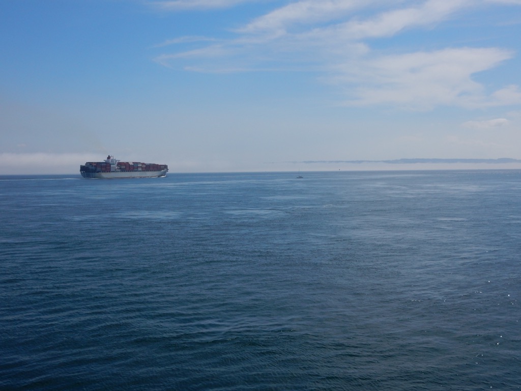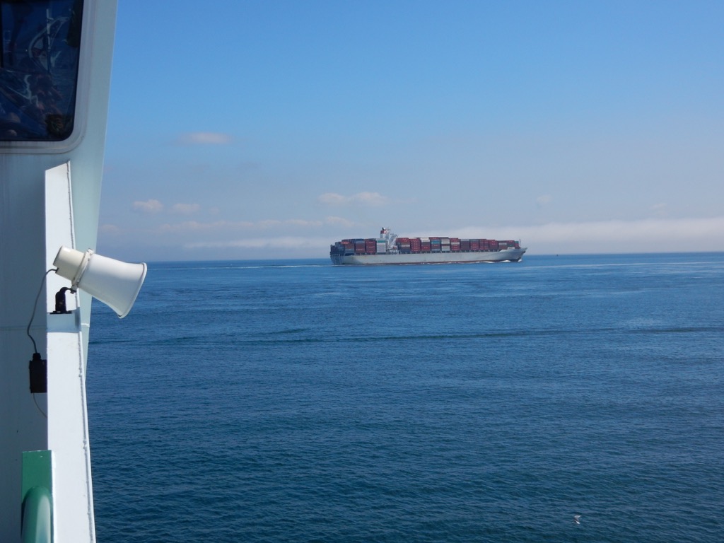 A closer look at the Bremen Bridge after it crossed our path during our ferry crossing from Port Townsend, WA to Whidbey Island. Note the fog bank behind the vessel.