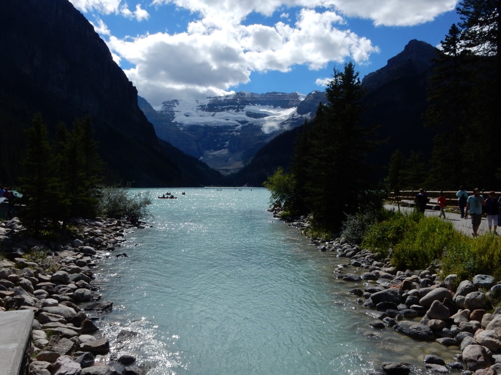 A view of visitors paddling their canoes from the creek leaving Lake Louise in Alberta.