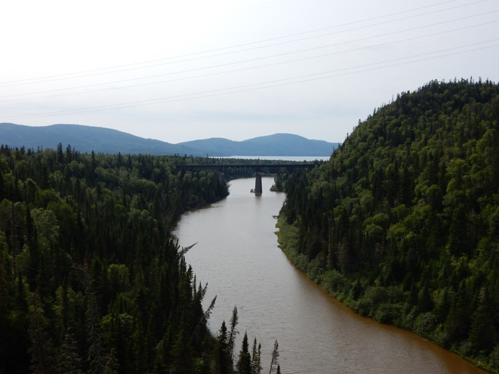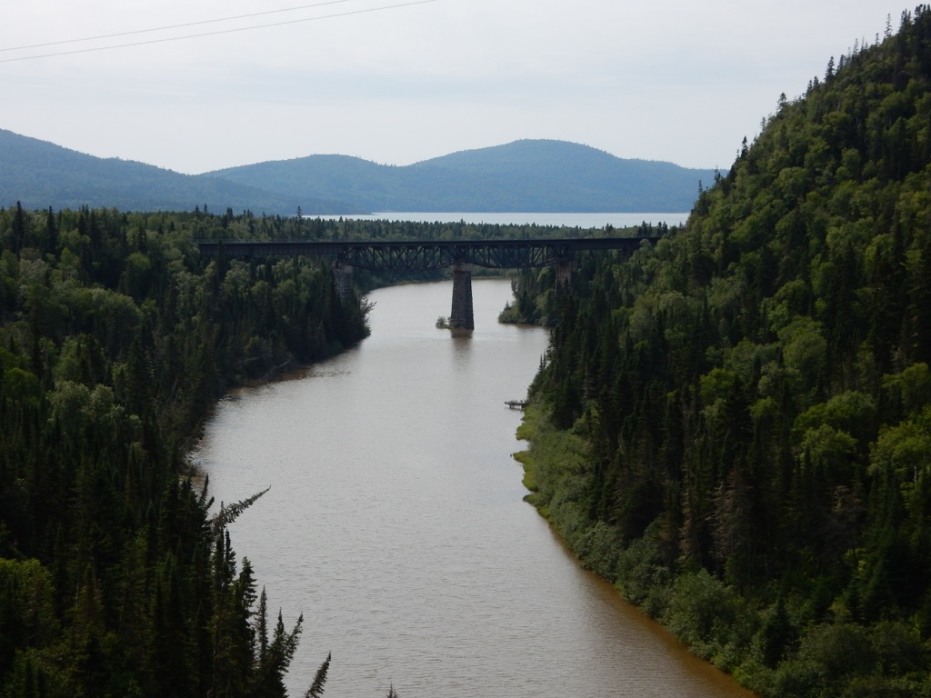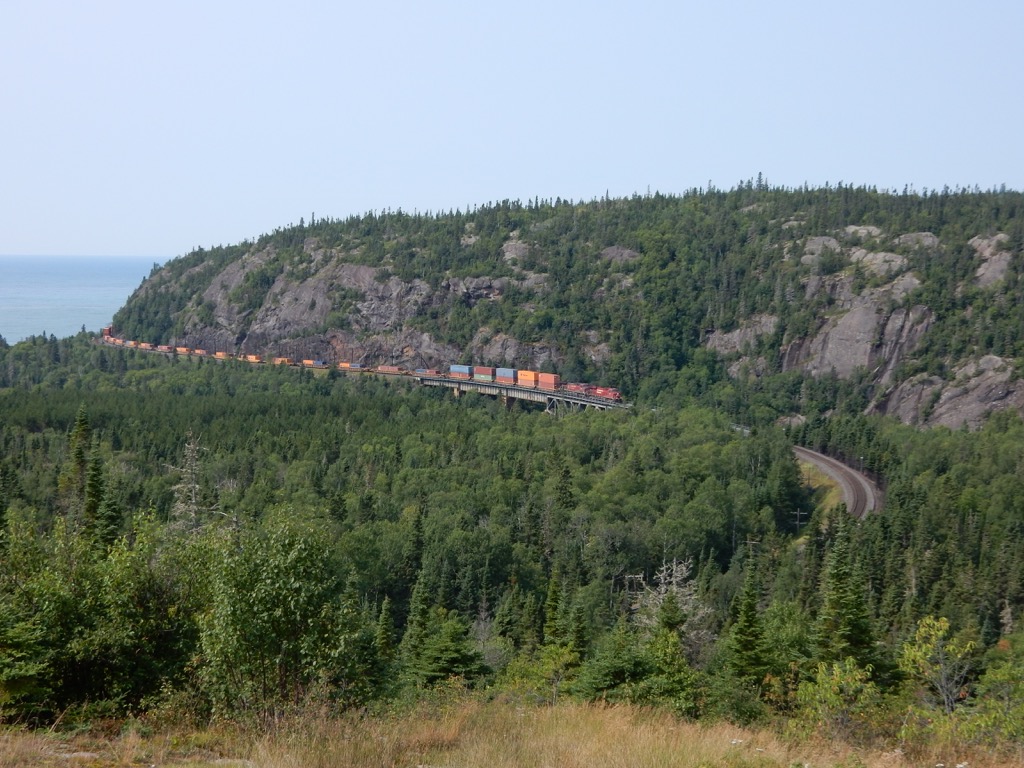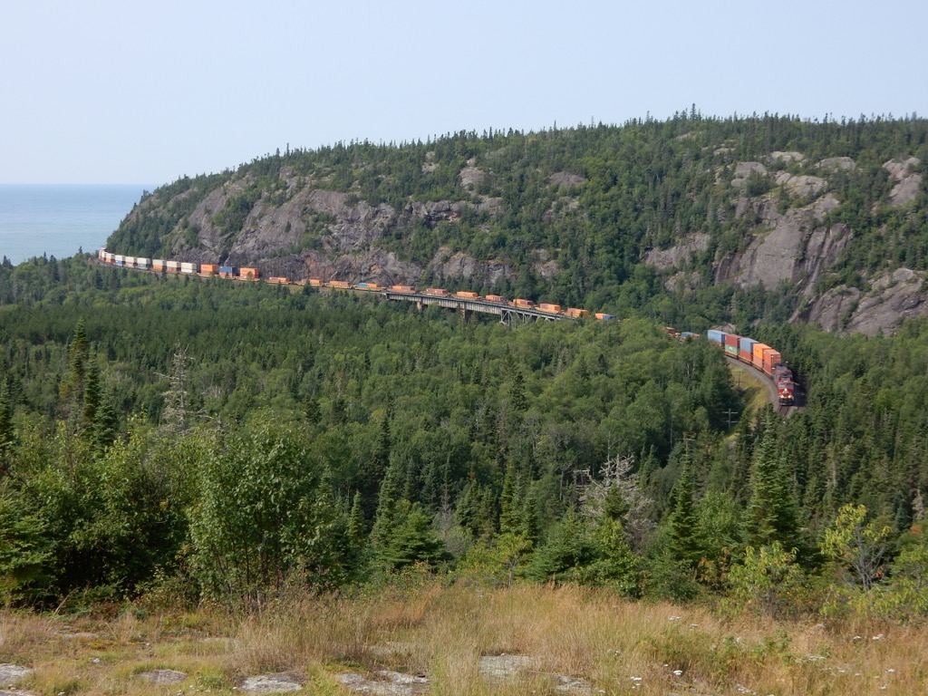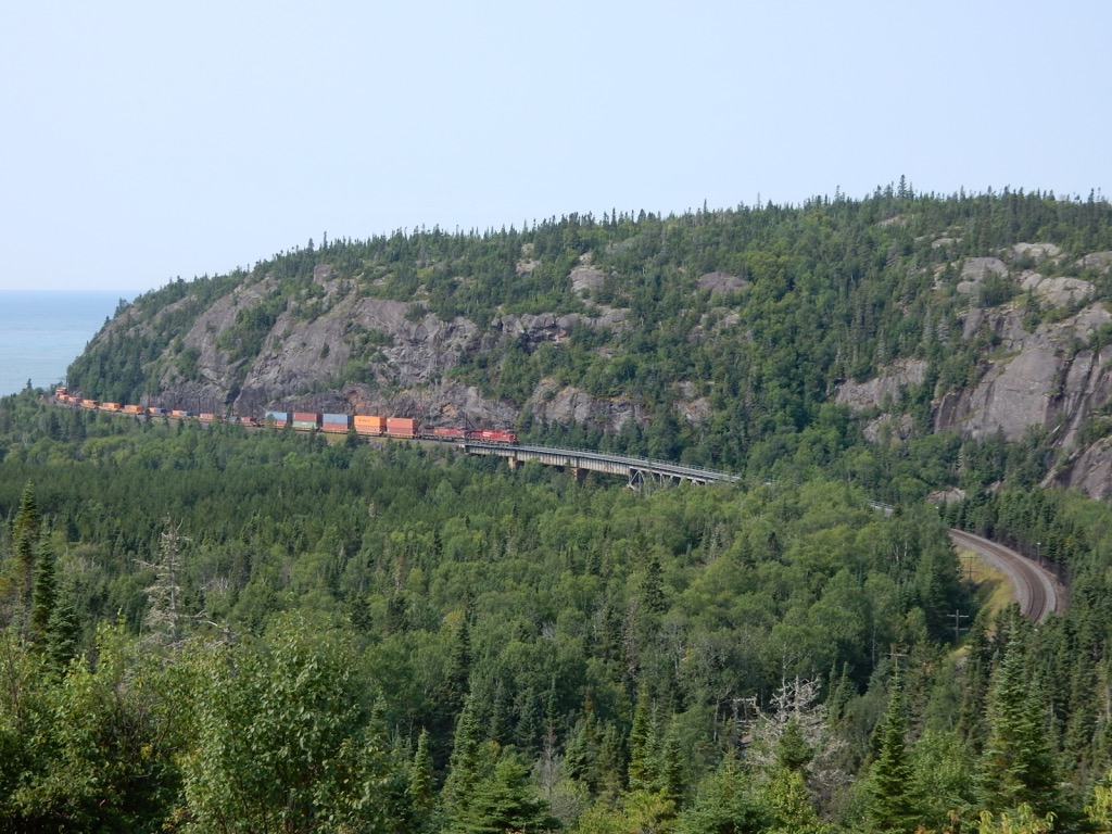 A Canadian Pacific intermodal train crosses a river at the west boundary to Nays Provincial Park in Ontario.