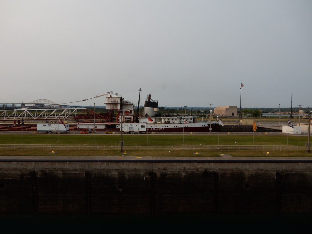 The Soo Locks tour boat exits the Soo Locks. The Cason J Callaway’s lock is filled and the gates are about to open.
