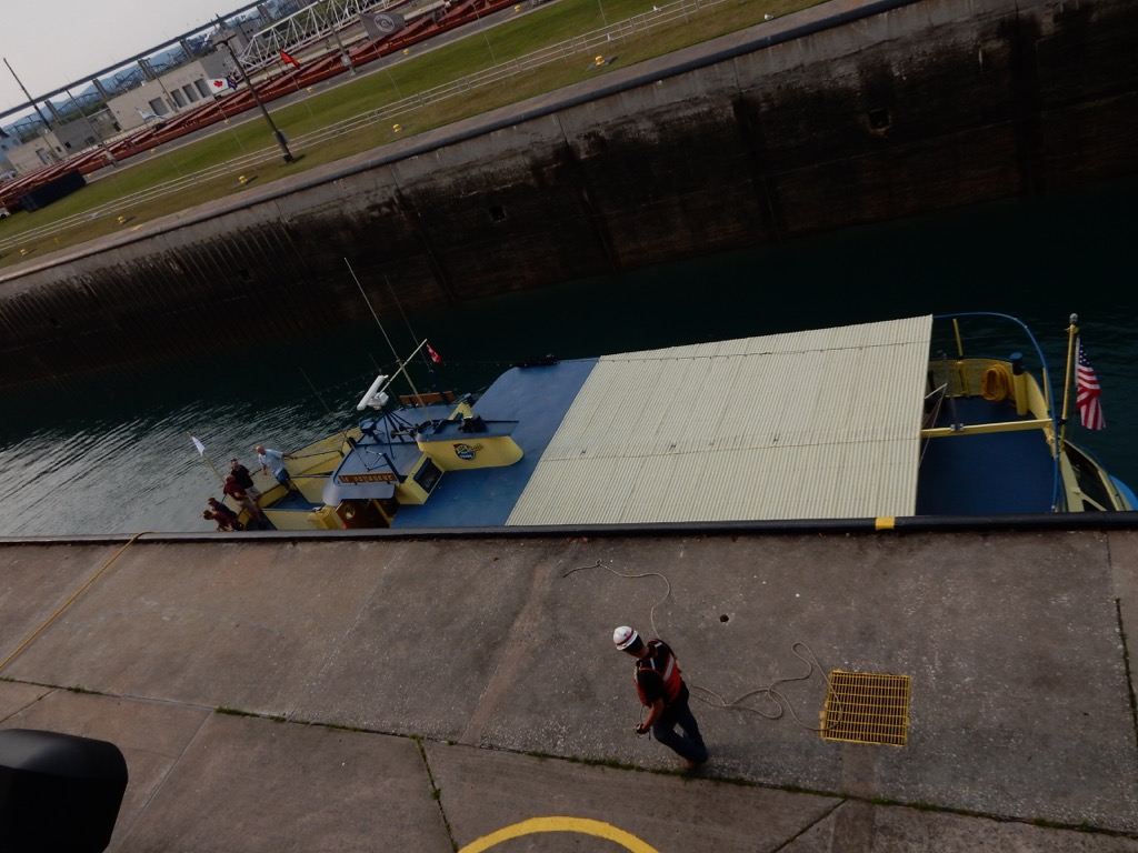 With the lock gate open, the Soo Locks tour boat pulls in its lines and prepares to depart.