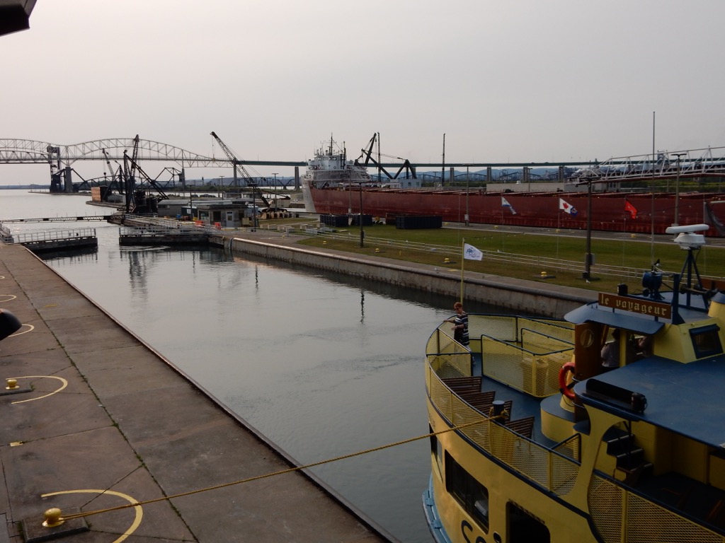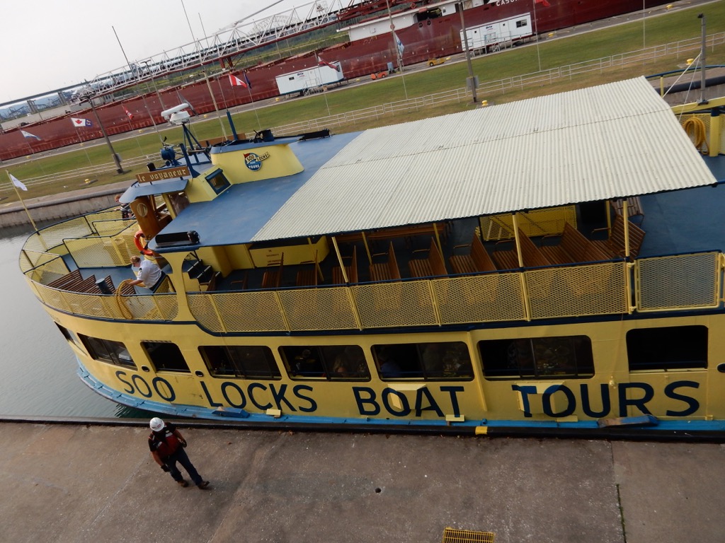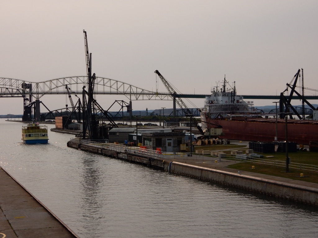 The Soo Locks tour boat passes upbound through the Soo Locks. The lock gates have just been closed and the lock is beginning to fill.