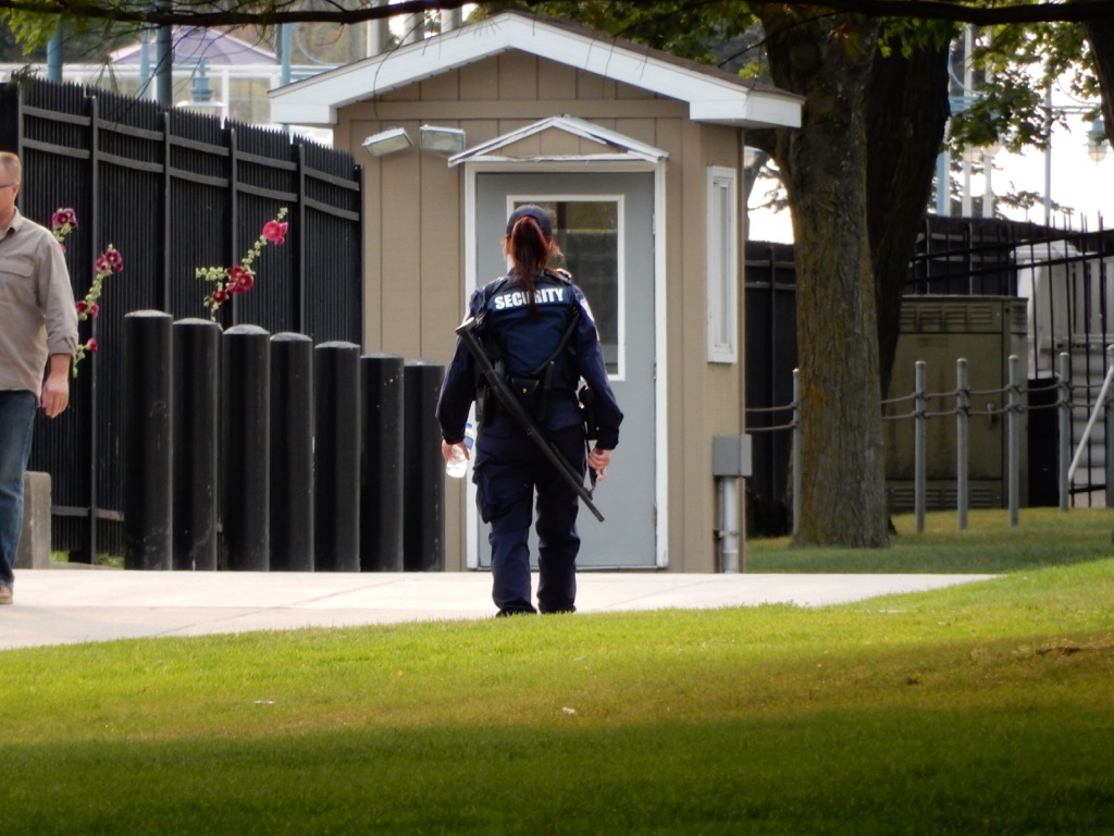 A well-armed member of Homeland Security heads for the guard house at the end of her shift at the Soo Locks. She smiIed at me when we passed each other, but I wouldn’t mess with her.