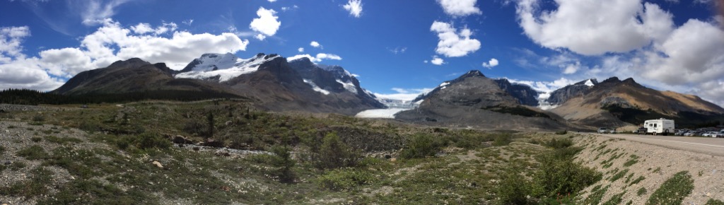 A panorama snowfields and ranges surrounding the Athabasca Glacier in Jasper Park.