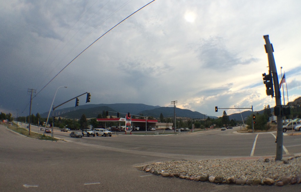 The intersection of US93 and US12 in Lolo, MT. While I successfully stayed in front of the nasty thunderstorm approaching from the south, I now need to turn west on US12 through Lolo Pass. The storm may catch me.