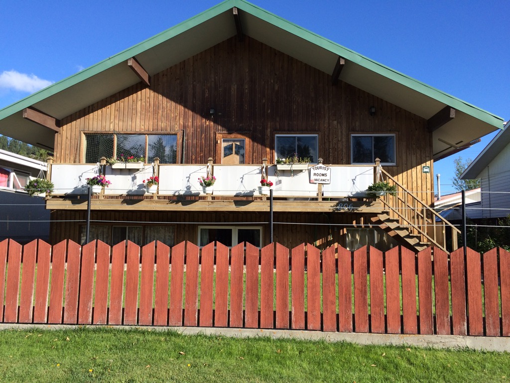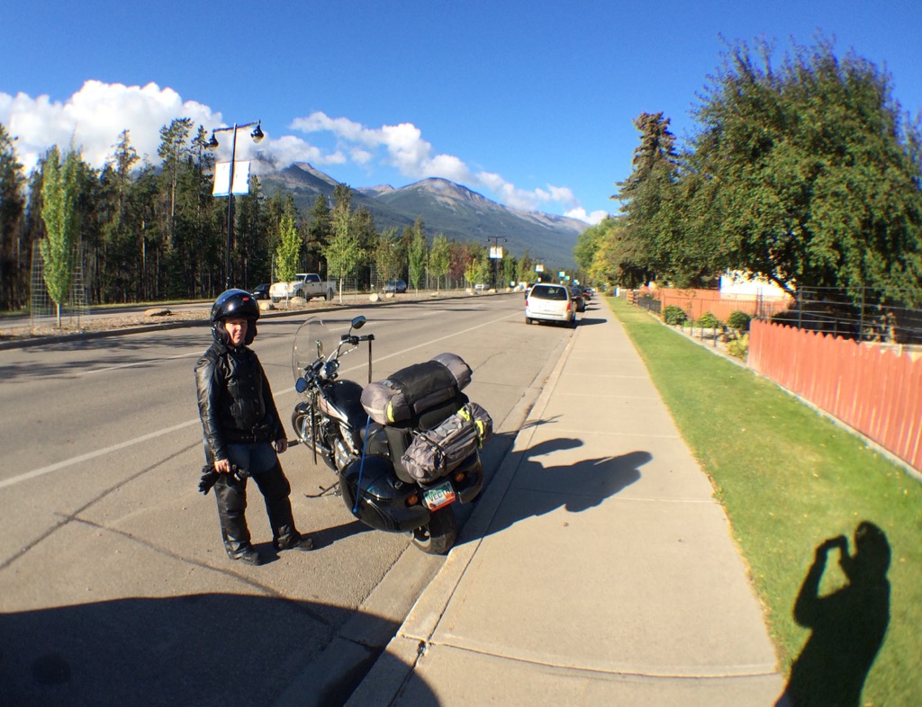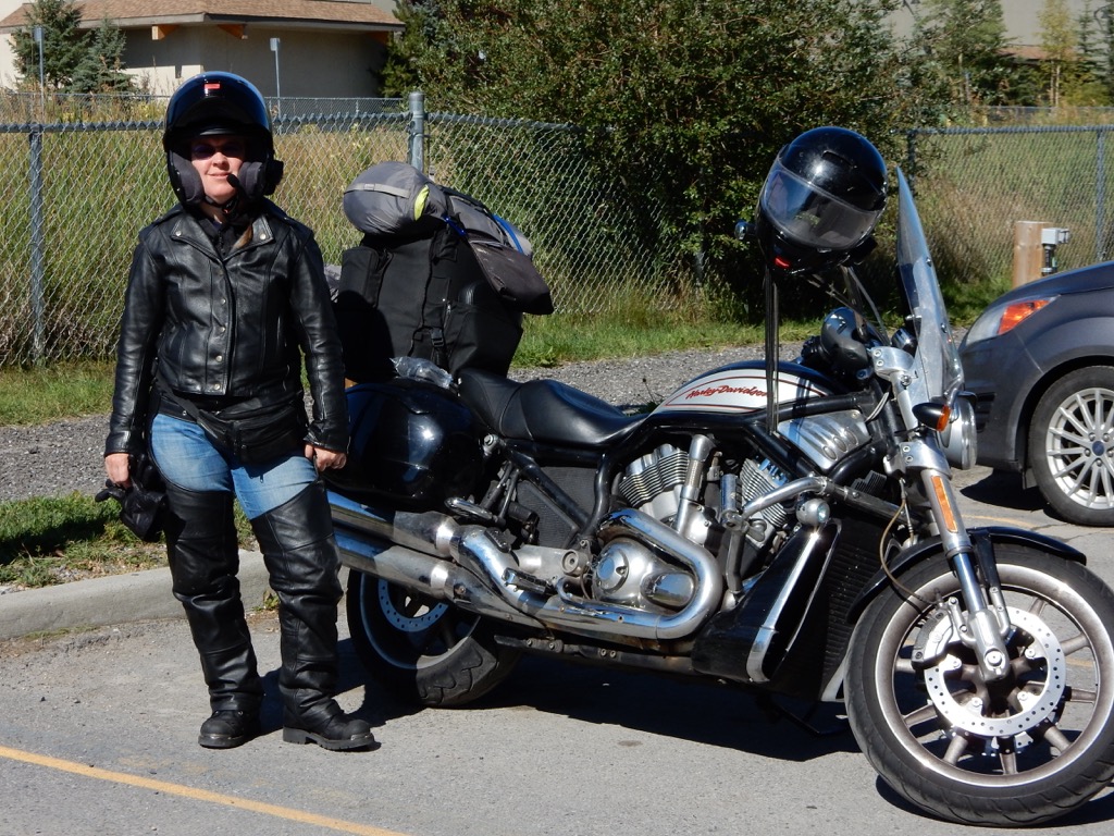 Karen poses next to the Vector in front of our lucky find of a cheap rented room in Jasper, AB.