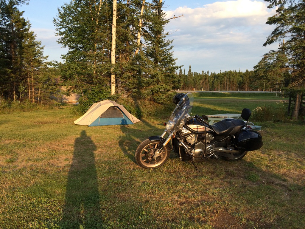 The photographers shadow stretches across the campsite for the evening at Nipigon, ON.