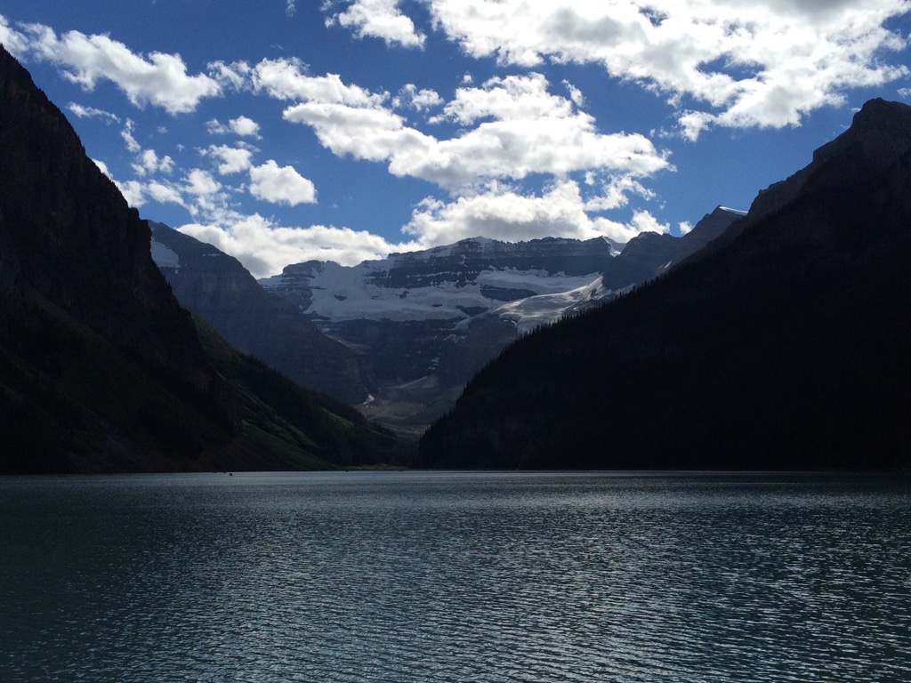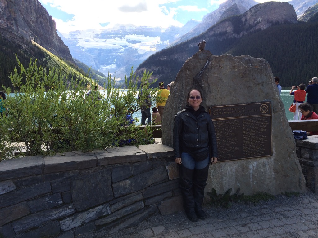 Karen in front of the Parks monument at Lake Louise in Alberta.
