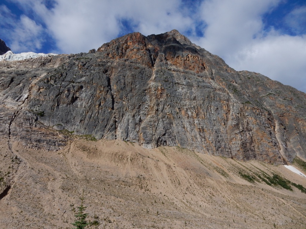 Damage from a recent rockslide on the face of Mt Edith Cavell in Jasper Park.
