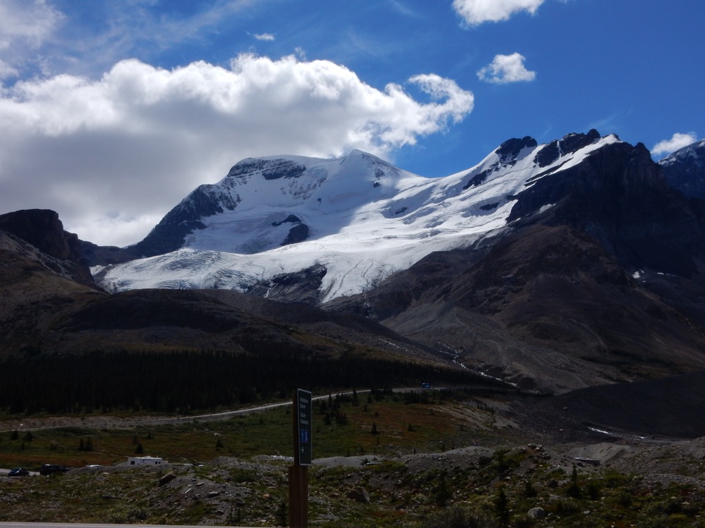Some late summer snow clings to the mountains east of Blue River, BC during a gas/snack stop.