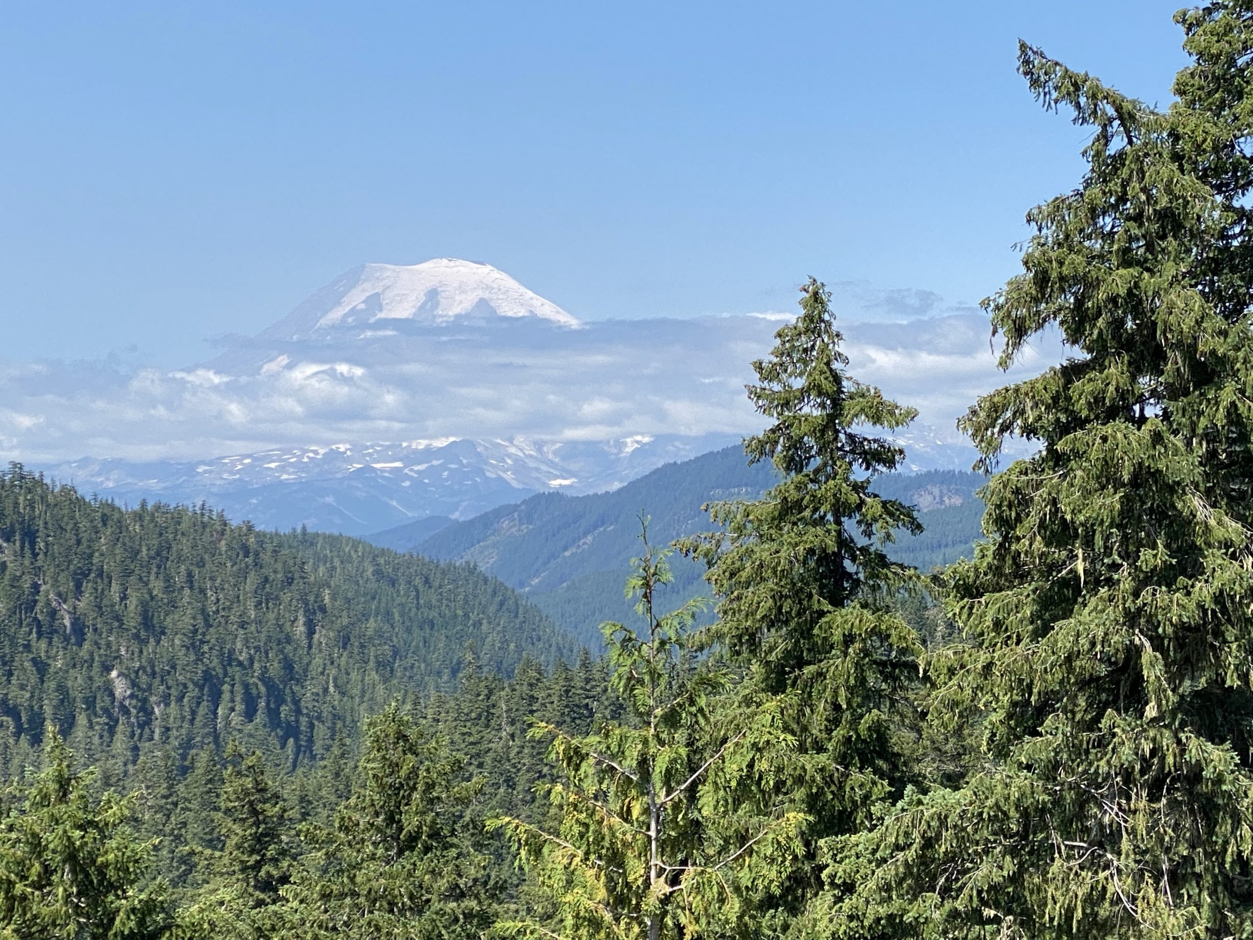 I rode past the ski resort at White Pass, all the chairlifts dormant for the summer season. A few miles down the west side of the pass, you come around a right-hand curve and, quite suddenly, there’s Mt. Rainier in the distance. This view was smoke free, but it is rarely cloud-free (I’ve only seen it devoid of clouds once). Today there were some clouds around some of the upper elevation, but not the peak. Photography ensued.