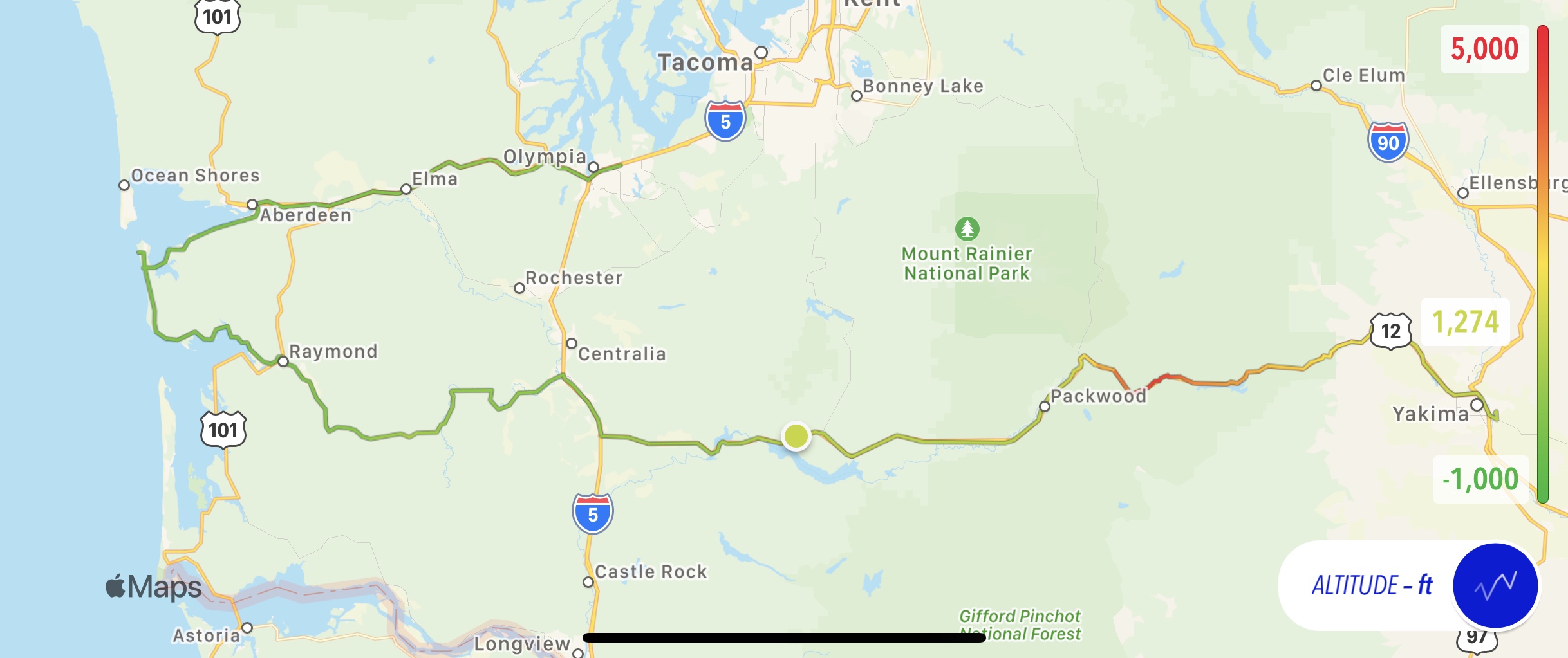 Here’s today’s map with an altitude overlay. The only high spot is White Pass east of Mt. Rainier. After that, it’s all downhill to the coast.