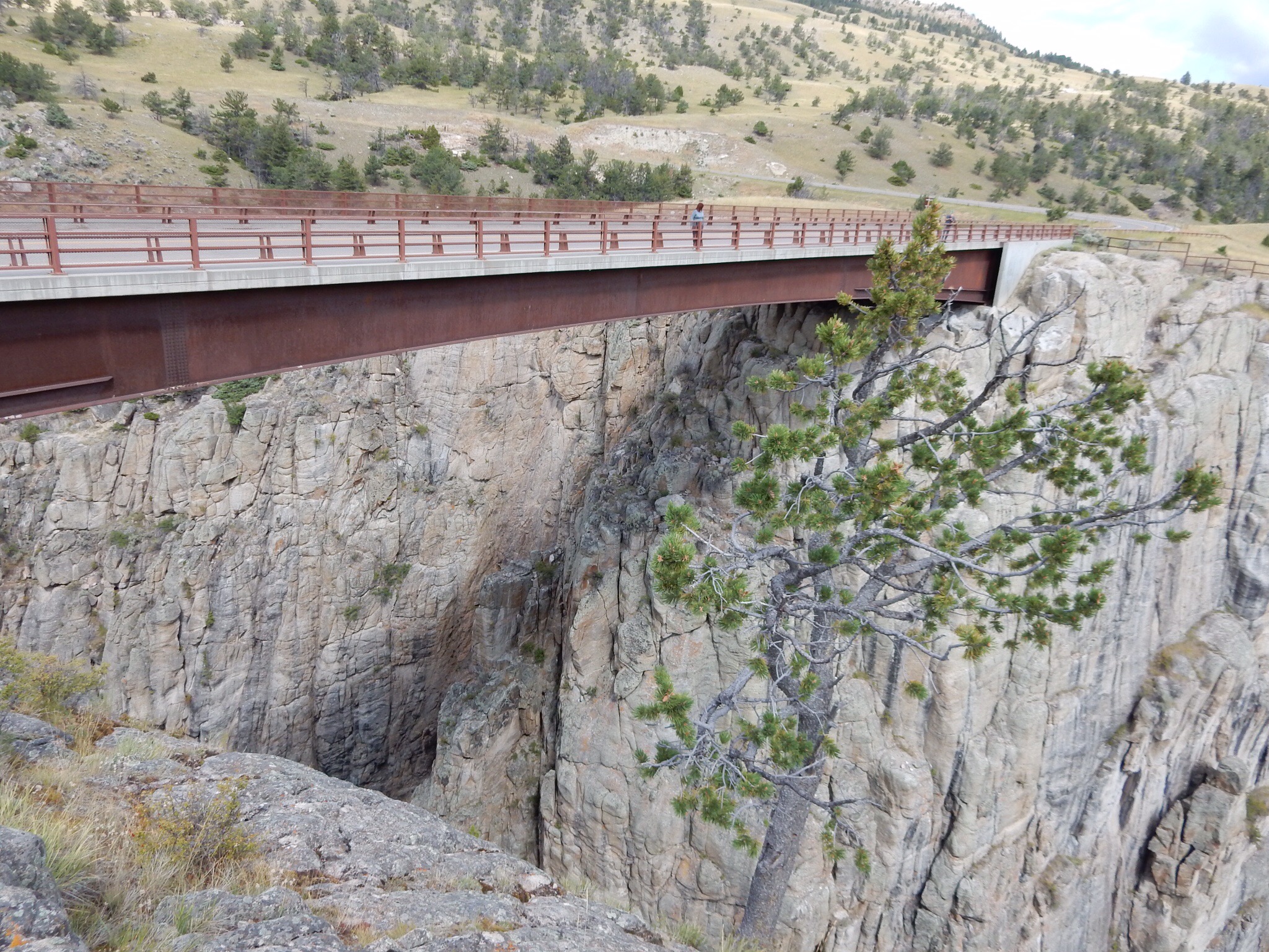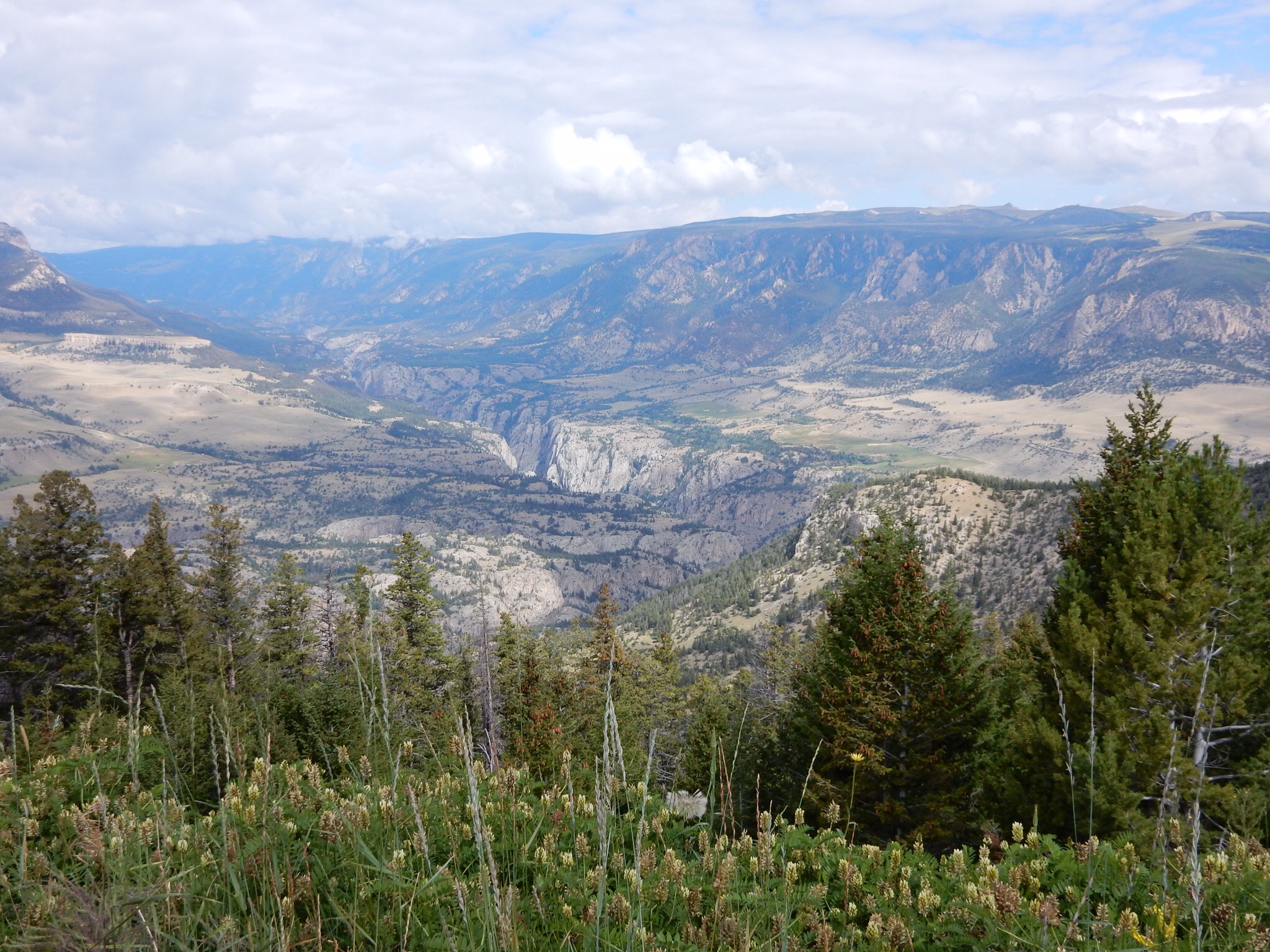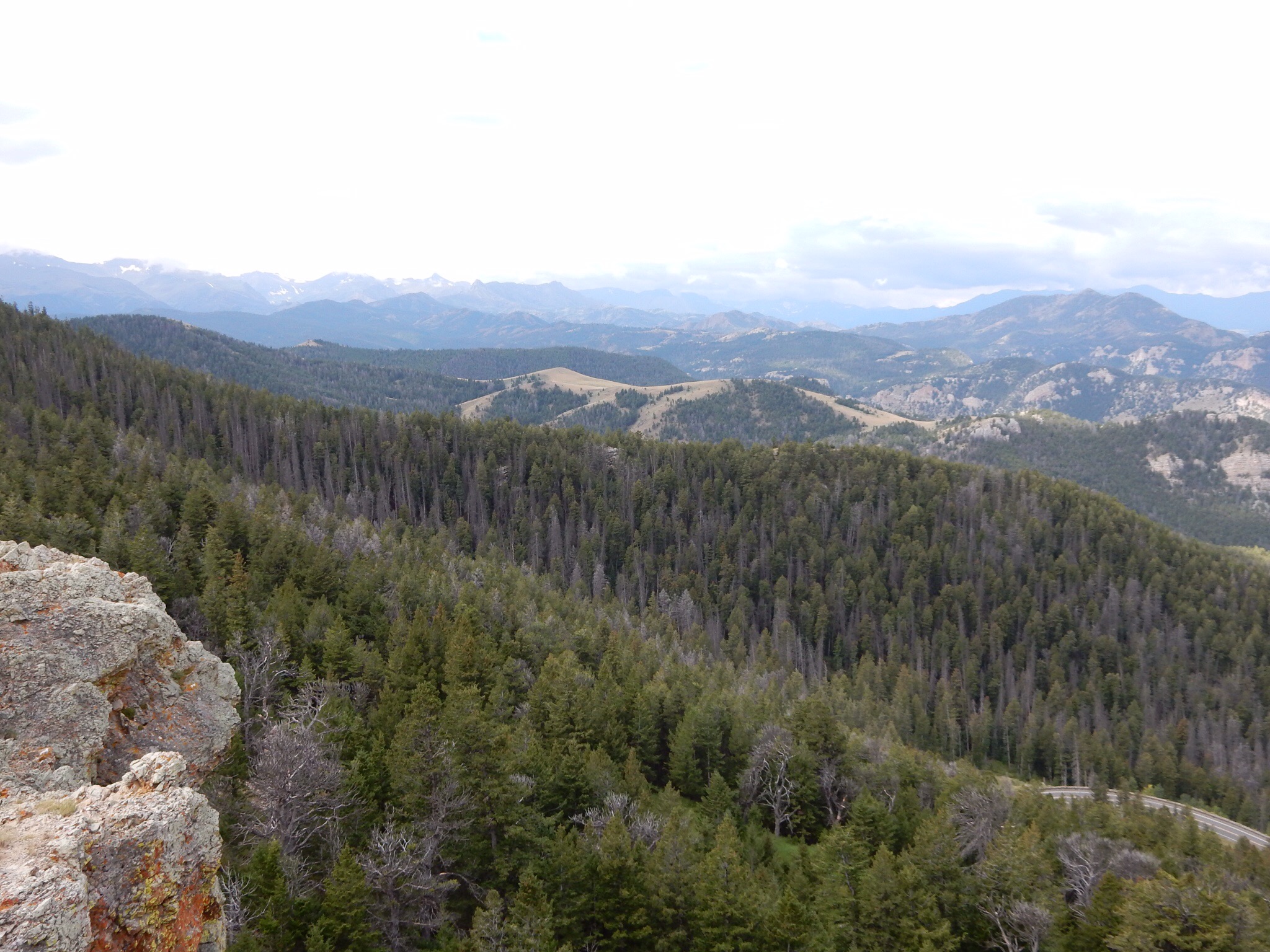 When traveling west, the Chief Joseph Scenic highway starts with a gentle winding climb up a mountain range, tightening around a set of switchbacks before cresting the pass. There’s a scenic overlook that looks west down the range and along the valley that you’ll be riding in for the next half hour. In the middle of the valley is a gorge for a small river. All of this is visible from the overlook. Do not blow this one off. I stopped for photos and visited a bit with the Golden Retriever in the back of a fellow traveler’s pickup truck.