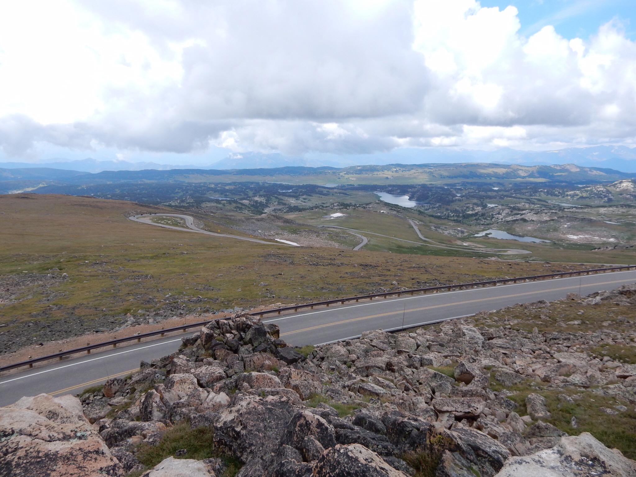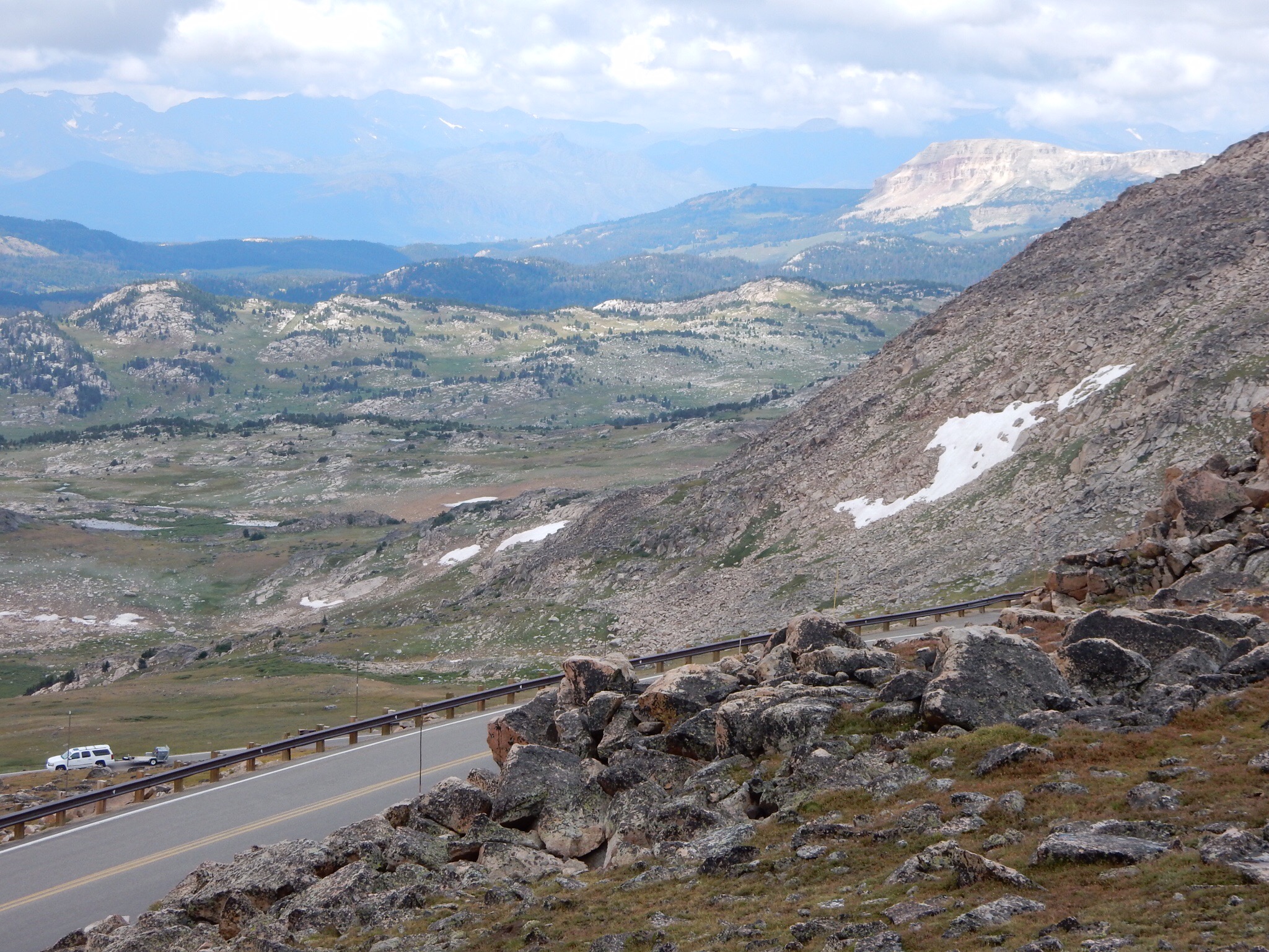 The air got quite a bit colder during the trip up Beartooth. I already had my flannel on over my t-shirt, so I added some heat to the grips and seat. I stopped for my customary photo of my Bike at Beartooth Lake (I always stop for a photo here). The scene changed a bit this year. Sometime since my last visit, the parking area got paved and the edge towards the lake now has a nice stone wall. Someday I’ll post all of my Beartooth Lake photos together with dates.