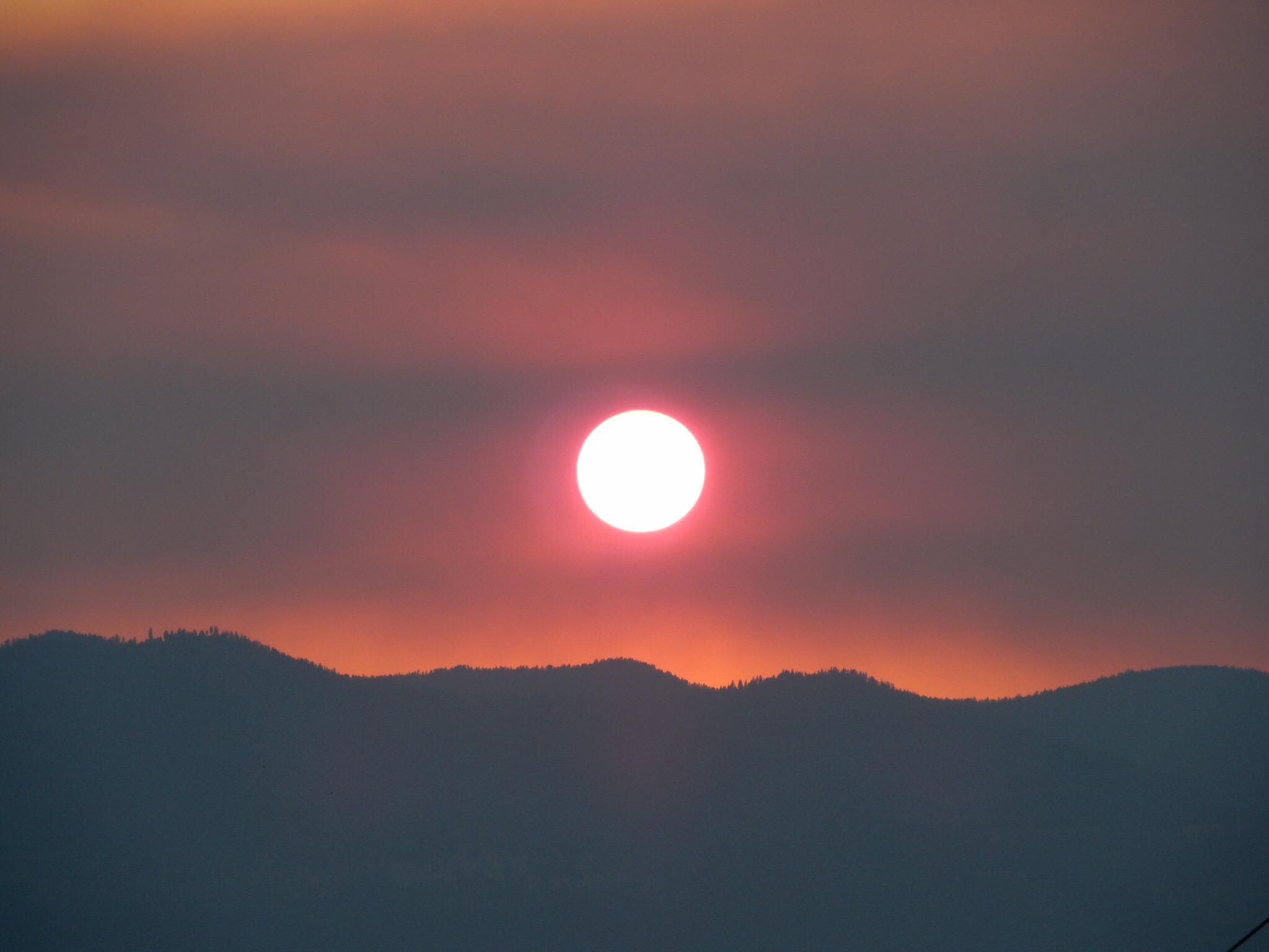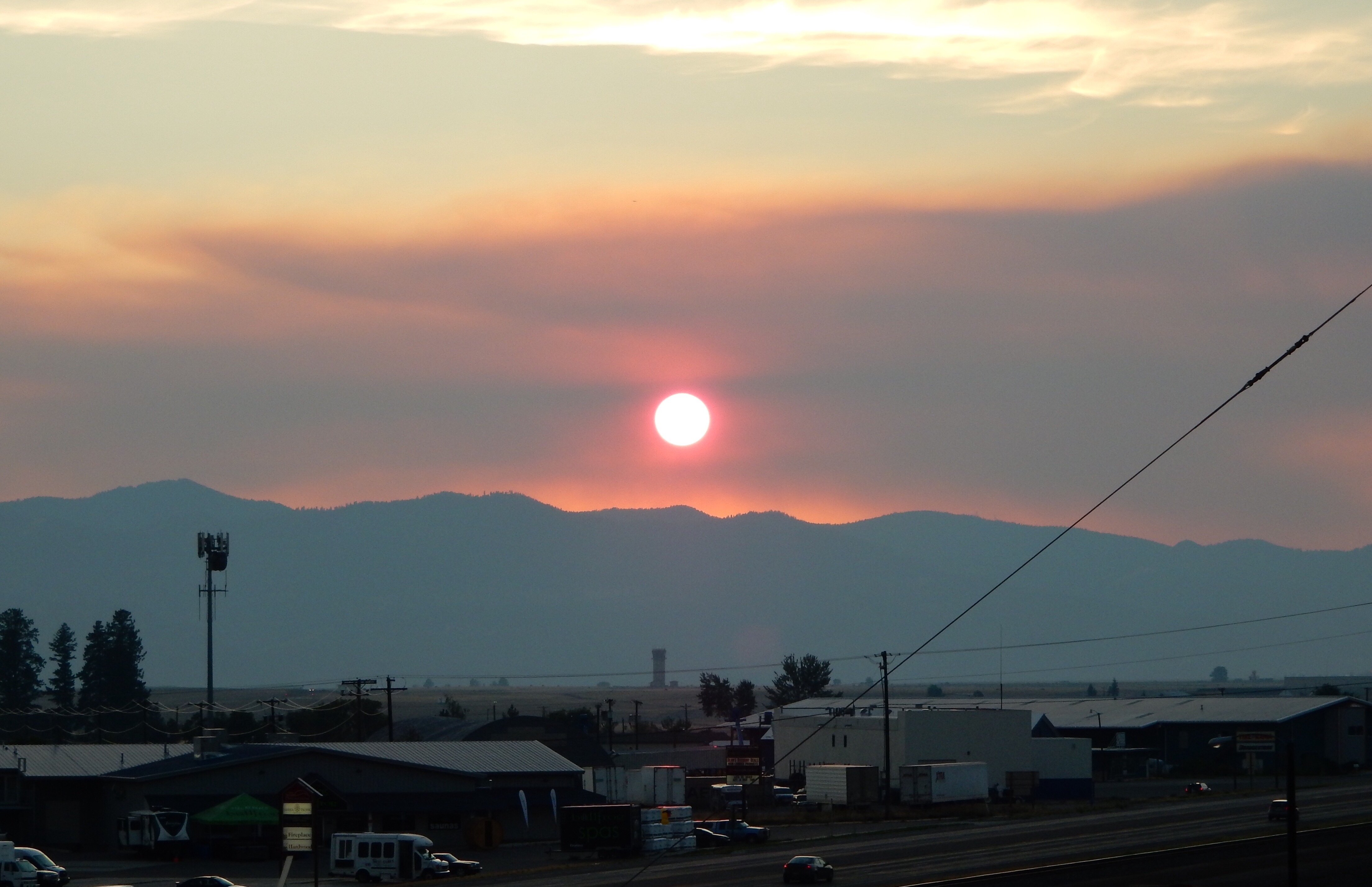 I made my way back up the main drag to visit an IHOP (International House of Pancakes) for dinner. Along the way, I rode over the overpass that crossed the Montana Rail Link yard. Looking west, I had a good view of the setting sun behind the smoke from the Lolo fire. I was compelled to take a photo or two.