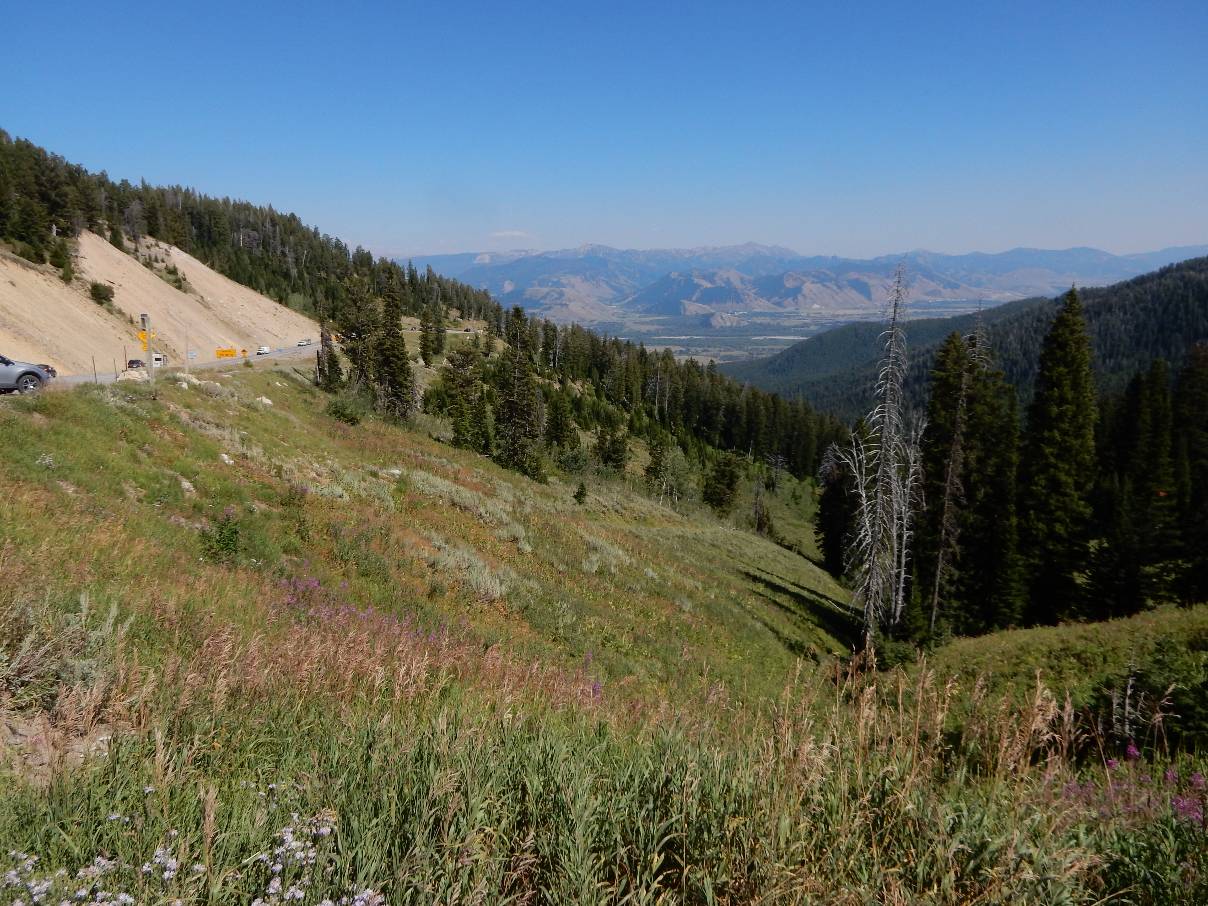 Just east of Victor, ID, you enter Wyoming and the road number changes from ID33 to WY22. The road slowly climbs a mountain pass until it gets very steep and curvy near the top of the pass. Then, quite suddenly, the view opens up and there’s a scenic overlook where you can gaze down into the valley and Jackson Hole in the distance.