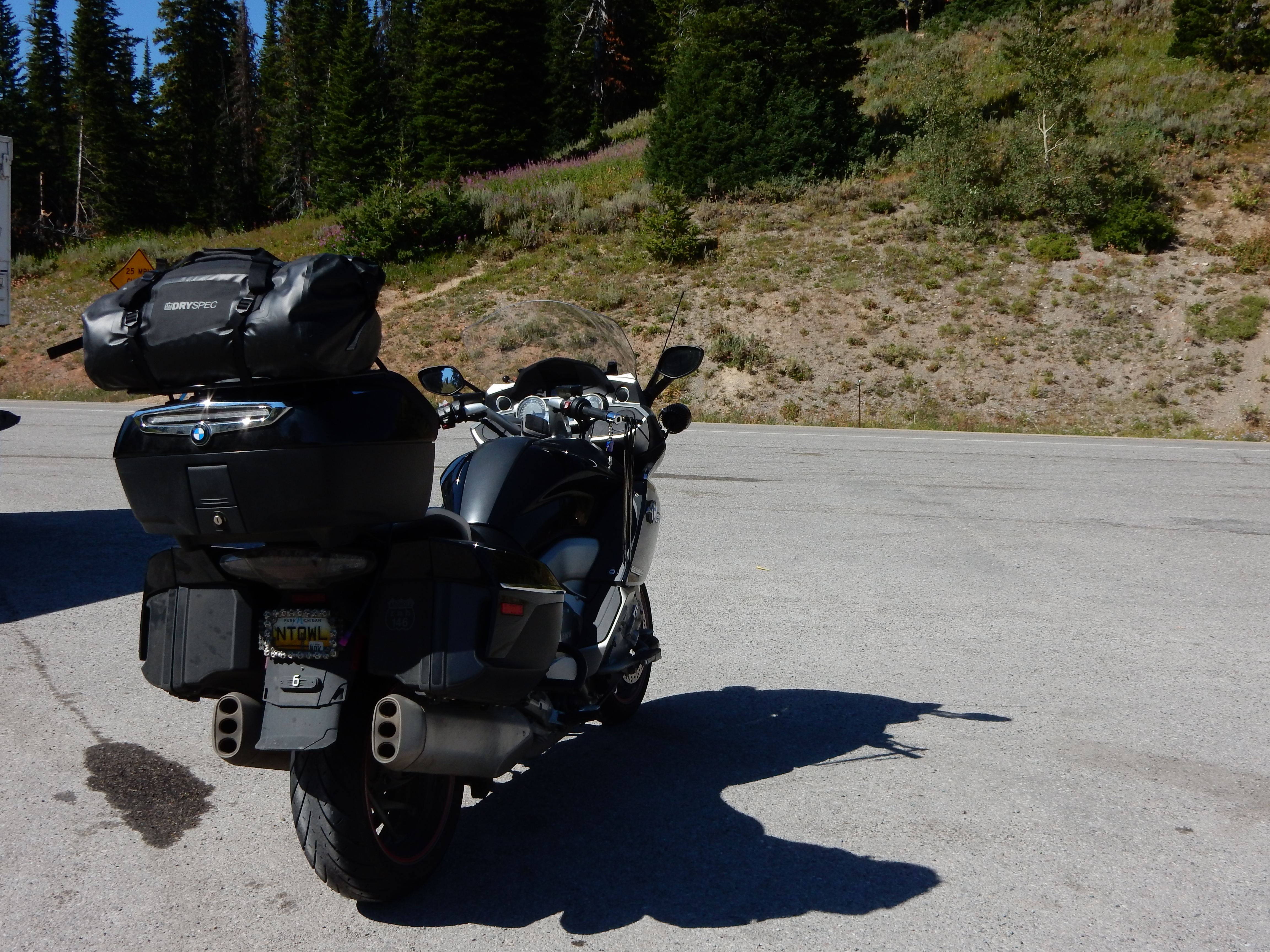 Heading east out of Grand Teton National Park, US26 takes you over Togwotee Pass. The run up the pass isn’t twisty, but consists of wide sweeping curves that can be taken at highway speeds (or greater). I was enjoying the receding view of the Tetons in my rear view mirrors so much that I stopped at the crest of the pass to take one last photo of the Tetons before I returned to the boring flatlands of the American midwest.