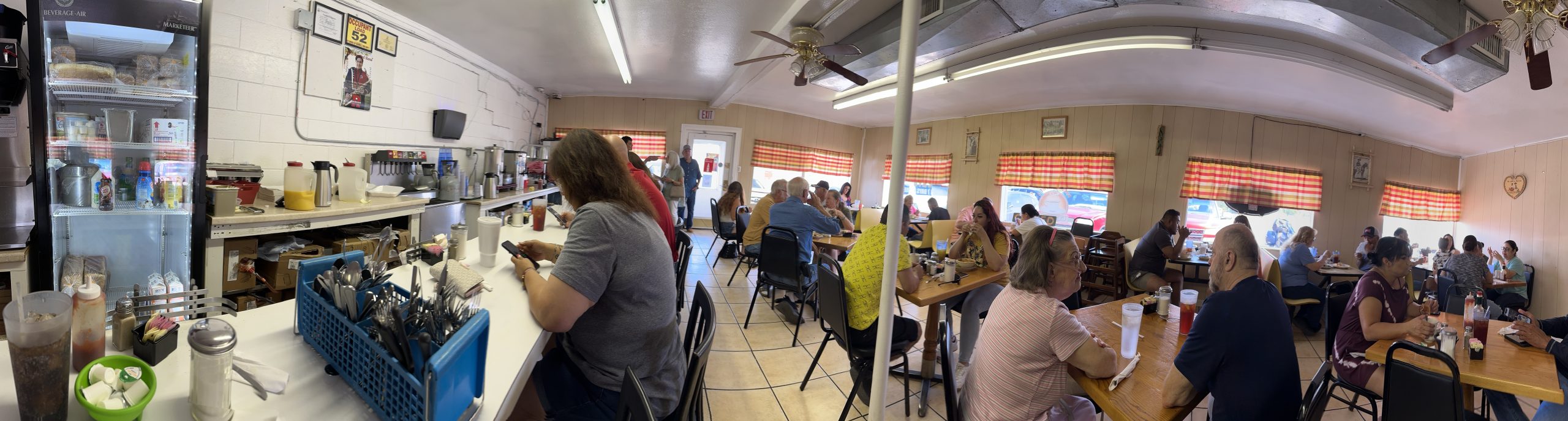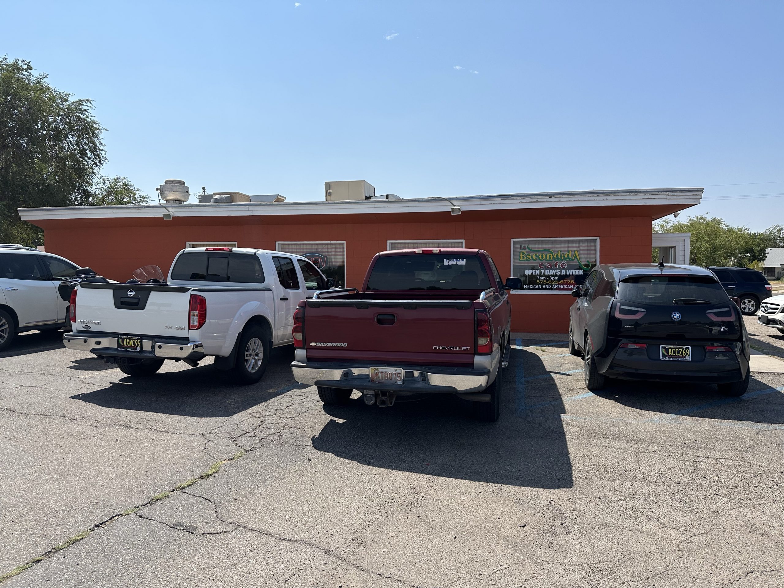 It was around 11am and I decided that a late breakfast/early lunch was in order. US380 is the main drag through town, so I rode slowly to scope out the available options. I saw a few national chains, which I summarily ignored. I saw a few local establishments that clearly were trying to attract tourists (“Free crayons for the kids!”) and they were surrounded with family truckster vehicles and RVs. Then I noticed a little red building, back a bit from the road, with a tiny sign out front touting La Escondida Cafe. In it’s parking lot were a few sedans and a bunch of (mostly dirty) pickup trucks.