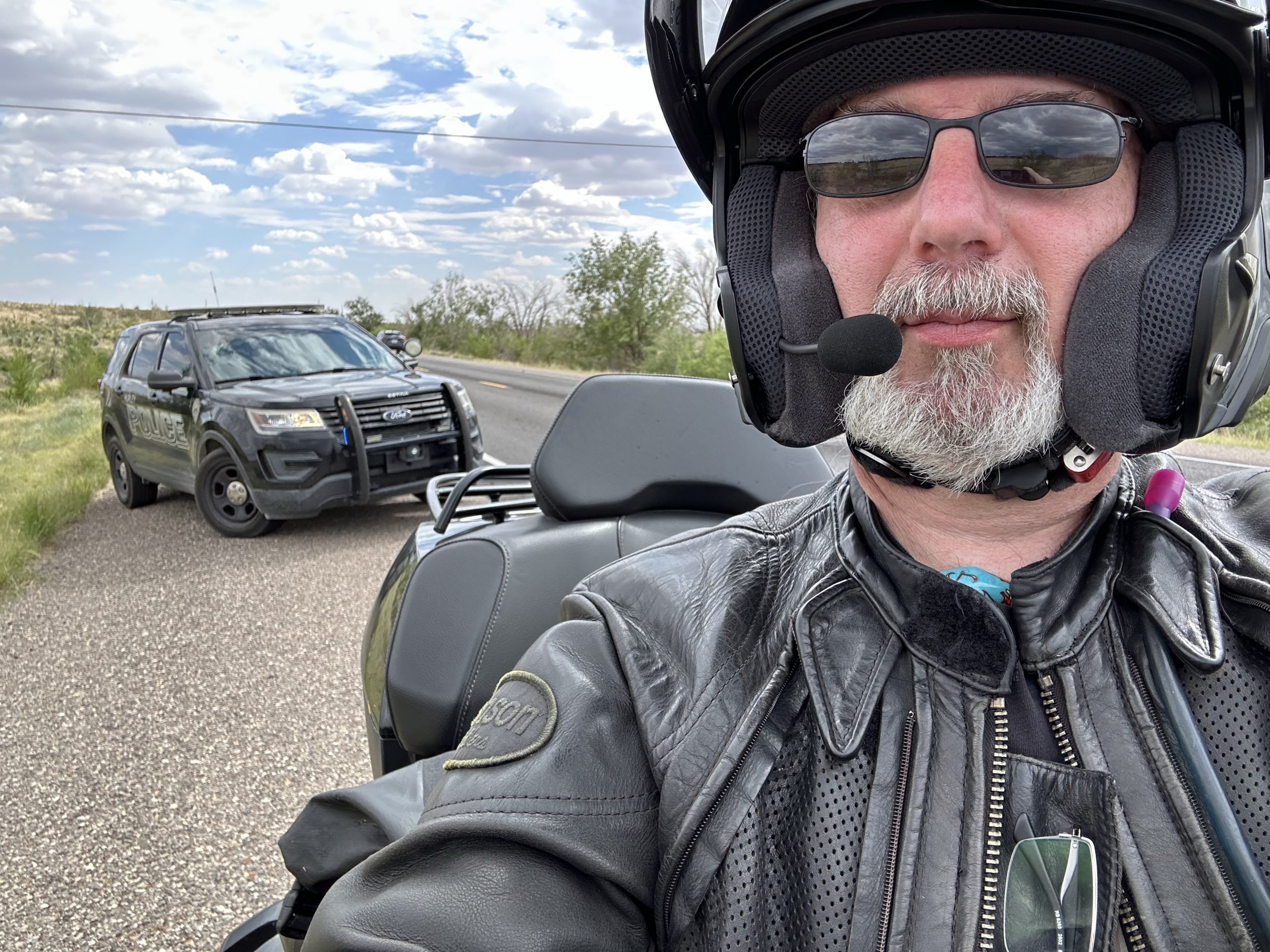 The officer introduced himself and noted that he clocked me at 68mph in a 55mph zone (that matched me earlier assessment). I explained that I’d been distracted by the locomotives in the yard and had failed to track my acceleration out of the S-curve. I made no attempt to defend myself. I handed over my license and registration, but I didn’t have the current proof-of-insurance on me; I did have it on my phone and showed it to him there, which he said was satisfactory. Glancing at my license, he noted the state (Michigan) and that started a conversation of why was I on a motorcycle on the opposite side of the country.