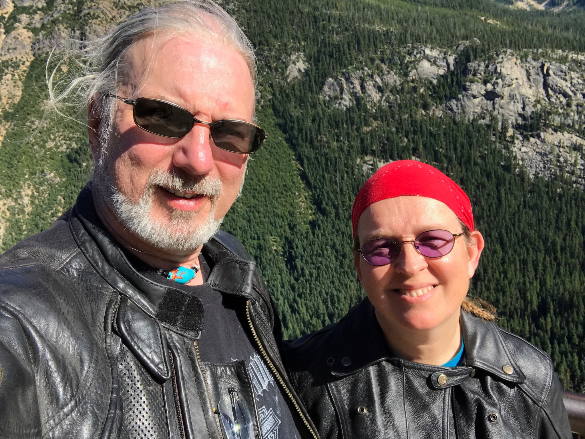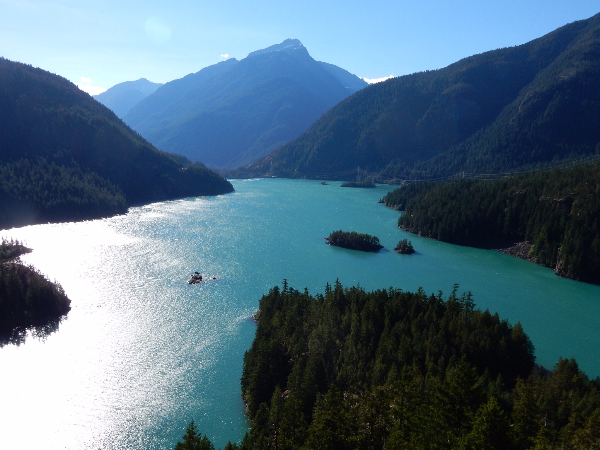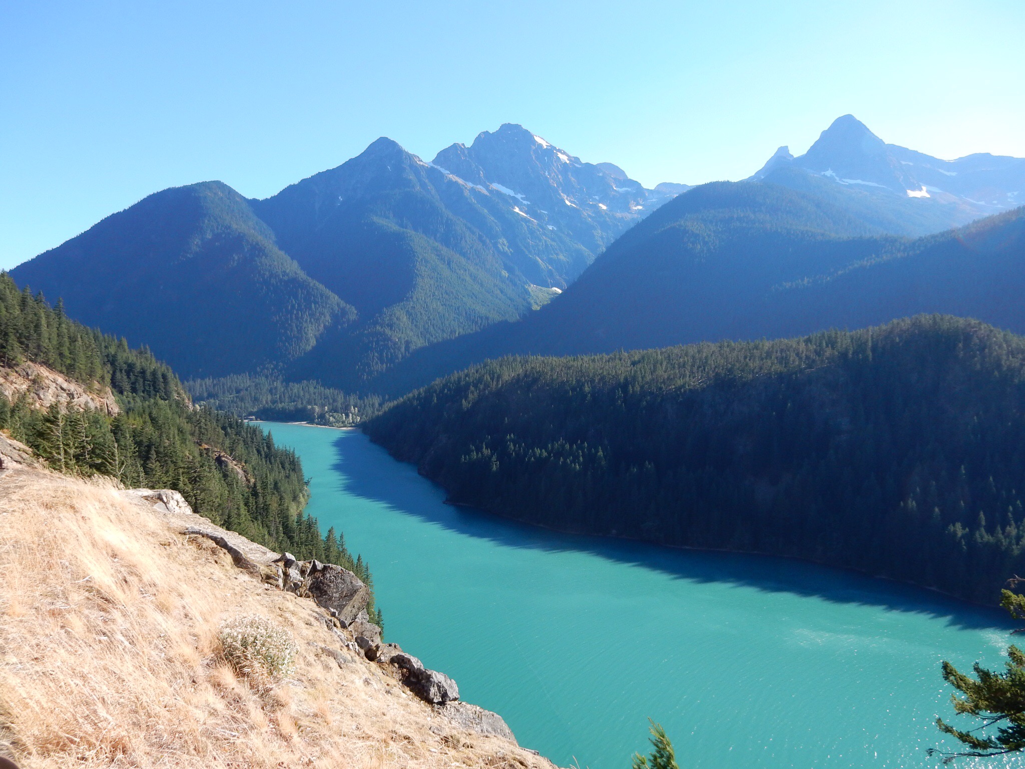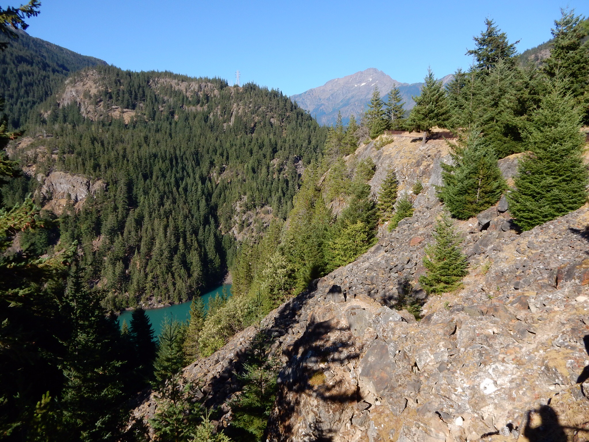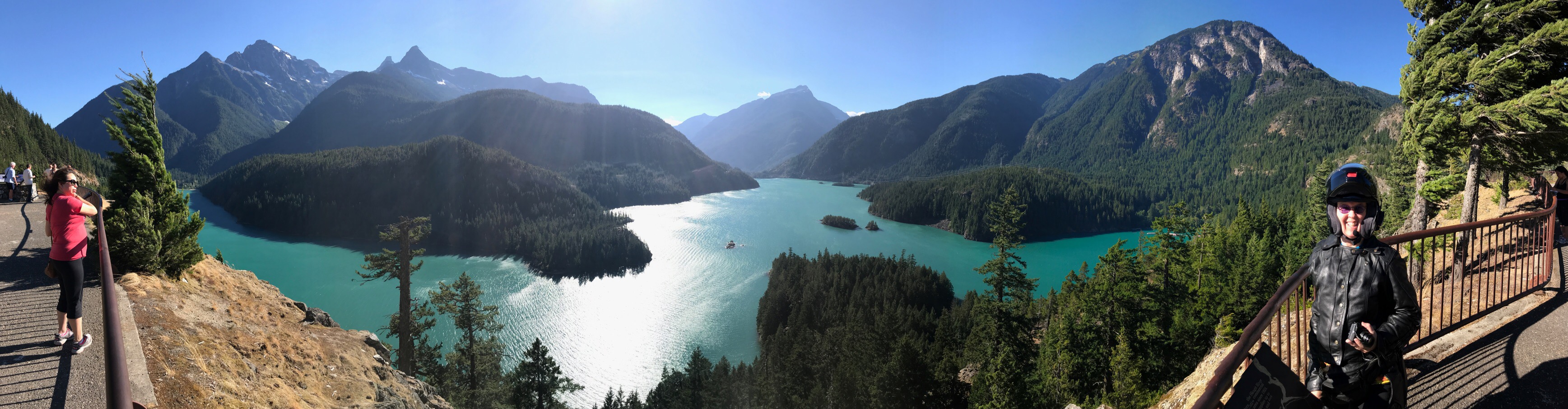 Continuing west on WA20, you dip down and then back up through Rainy Pass. It wasn’t rainy today. Then it’s a long descent to the series of reservoirs in the Skagit River valley. First there’s Ross Lake, which you can just barely appreciate from the road. Then there’s Diablo Lake. There’s a scenic overlook for Diablo Lake just off WA20. Again, if you do not stop here and appreciate the views, you will be mercilessly ridiculed. Be forewarned, this overlook can often be quite windy. If you have a habit of removing your doo-rag during stops, you might want to leave it on for this one. You’ve been warned.