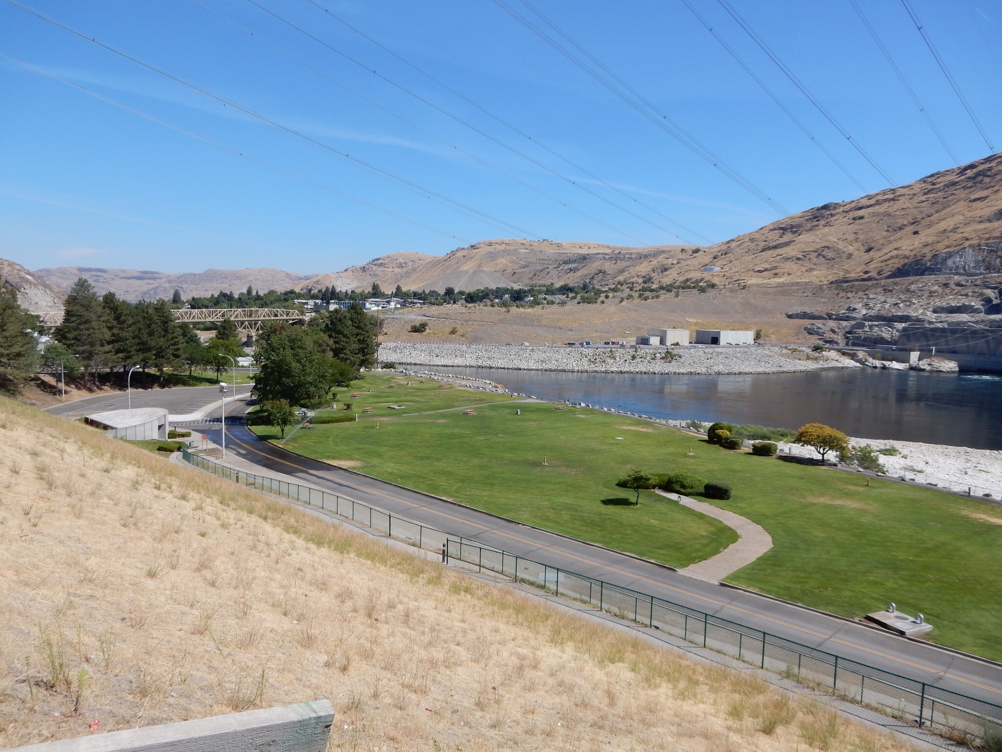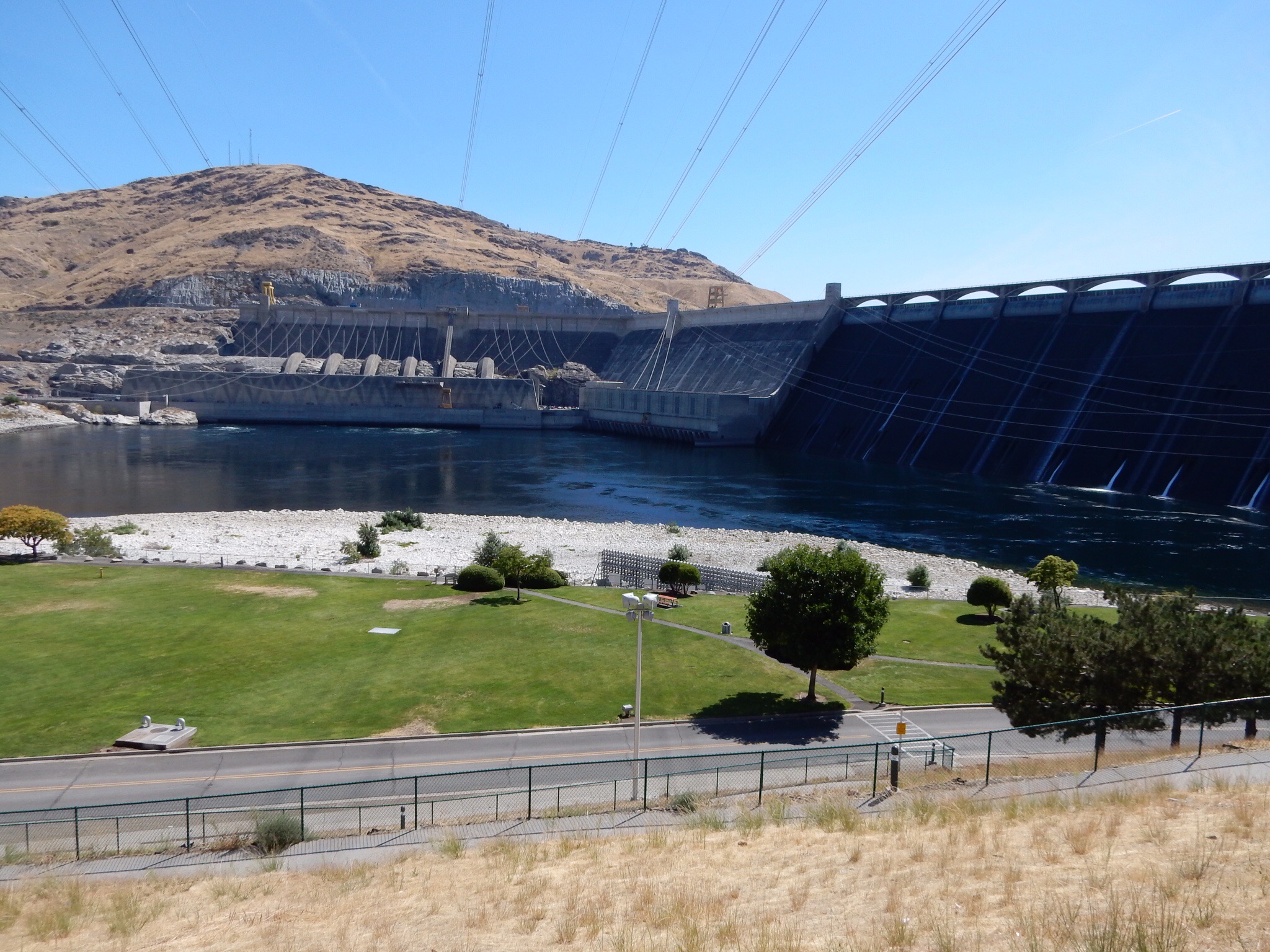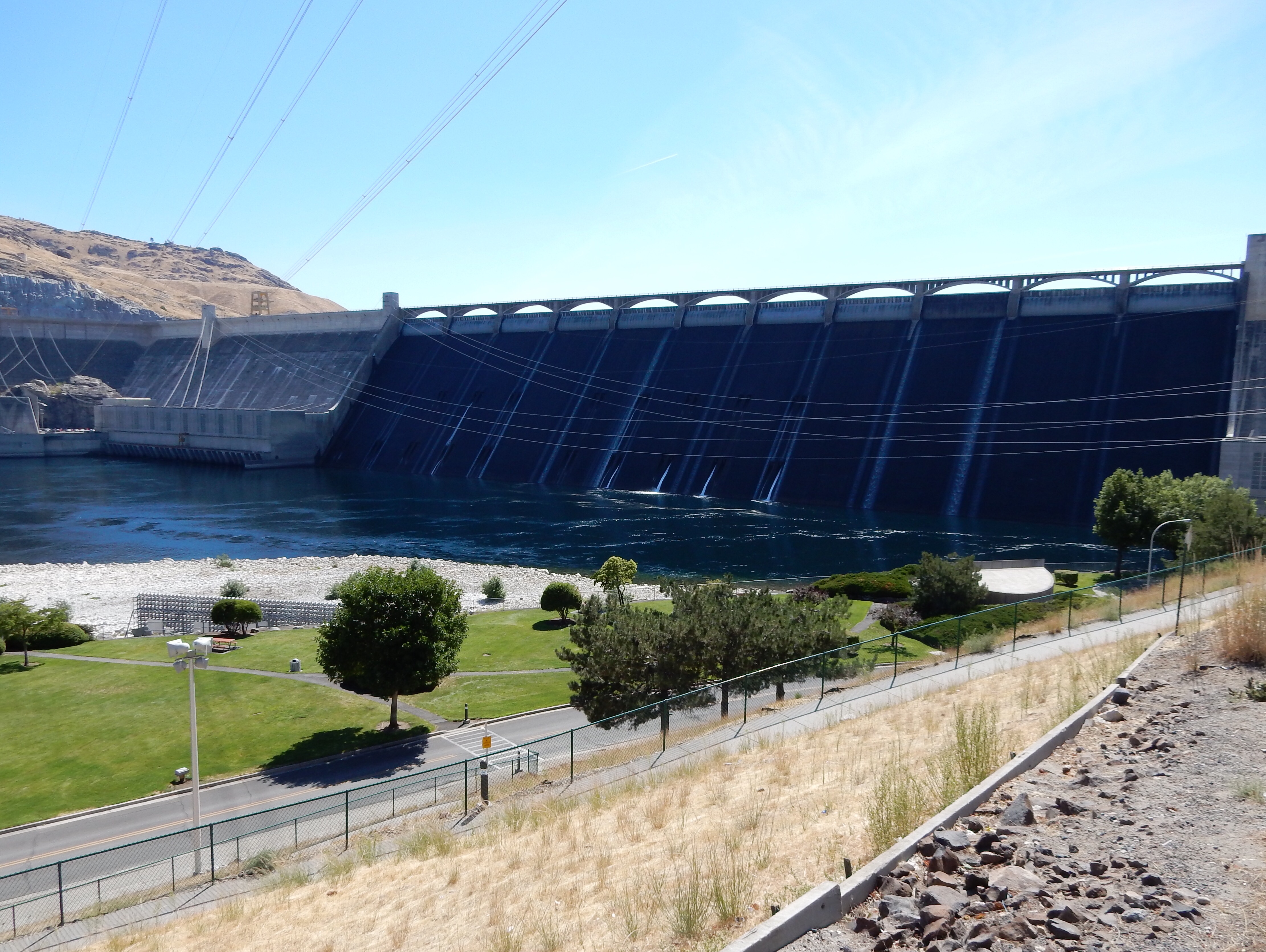 US2 ran just outside the front door of our hotel and that is was we started on headed west. We traveled from small town to smaller town before eventually turning northwest toward the Grand Coulee dam and Lake Roosevelt. The lake takes you a bit by surprise. You’re riding merrily along over rolling farm land and desert scrub when you suddenly dip down into a ravine and start a serious descent down to the lake. You’re upstream from the dam so you can’t really see it until you enter the town of Grand Coulee. That’s when you can appreciate the size of this piece of civil engineering. Very impressive.