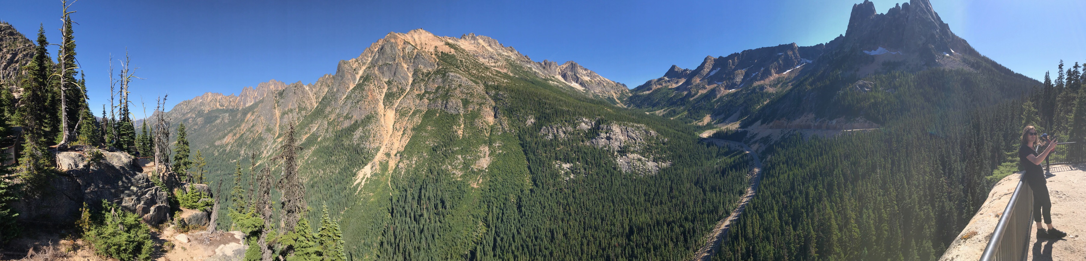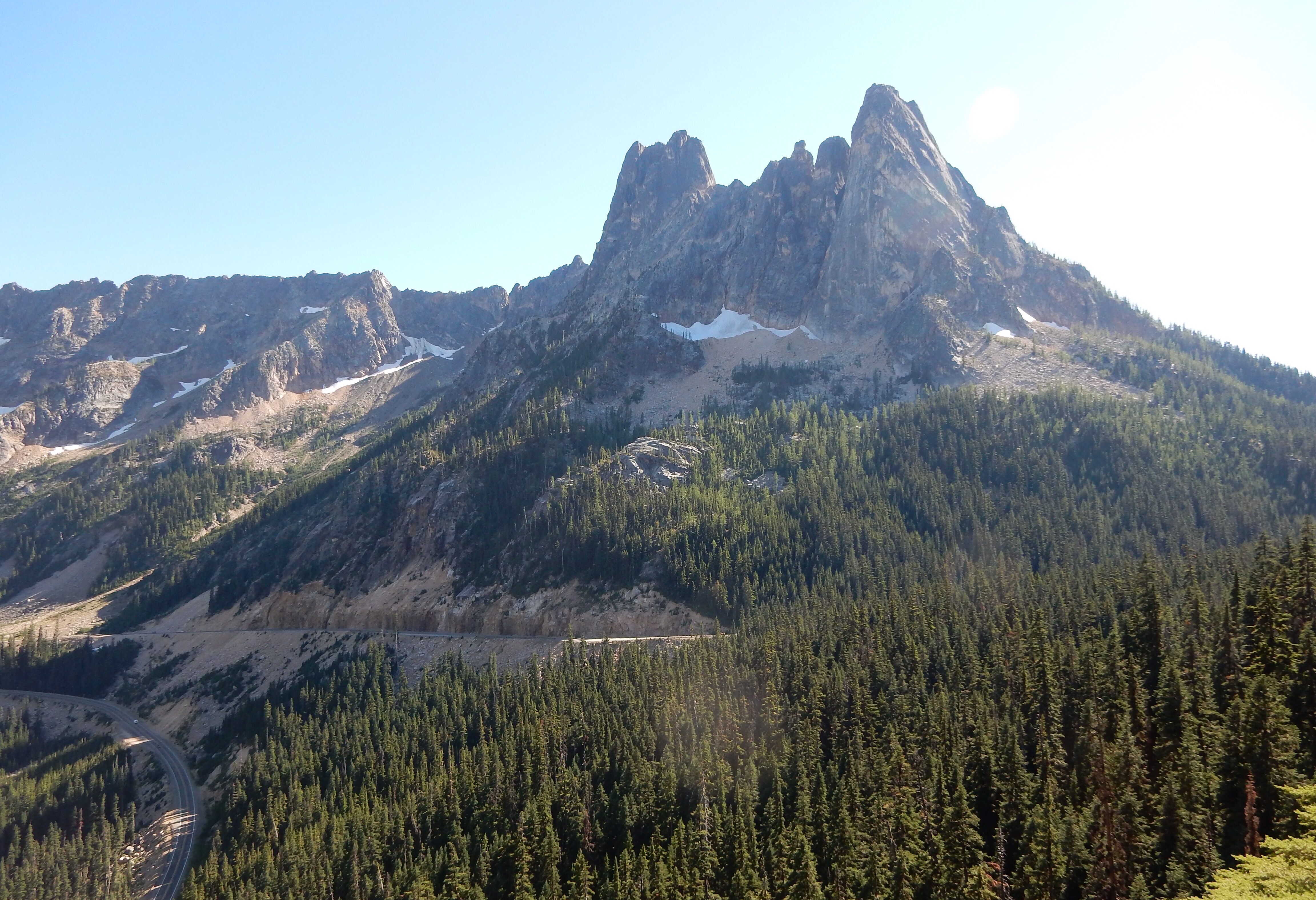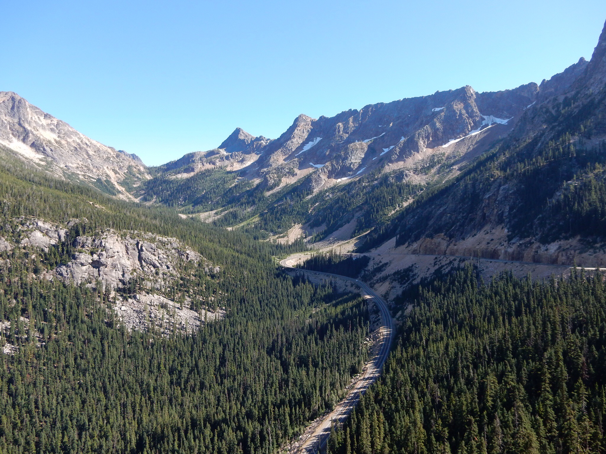 West of Winthrop, WA20 gets much more remote and starts to climb higher into the mountains. The climb culminates in a single switchback in the shadow of a tall mountain cliff, leading up to Washington Pass. There’s a scenic overlook just west of Washington Pass. If you don’t stop here and take the short (150 yard) hike to the overlook point, you’re a moron. Enough said.